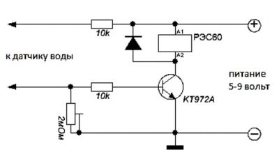 Toute personne familiarisée avec un fer à souder et ayant des compétences minimales en tant qu'électronicien radio amateur peut assembler un circuit électrique qui fonctionne sur l'apparition d'un courant électrique s'il y a de l'eau entre les contacts. Il existe de nombreuses options, à la fois simples et plus complexes. Donnons quelques exemples.