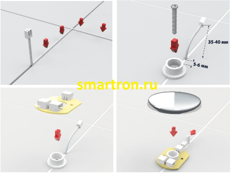 Lors de la fixation du capteur au sol, le fil peut être caché dans le socle, dans les joints entre les carreaux de sol. Fixez la base du capteur au sol. Un capuchon décoratif doit être placé sur la plaque. Des capteurs sans fil peuvent également être inclus dans le kit, ce qui simplifiera grandement la procédure d'installation. Les capteurs doivent être montés sur du ruban adhésif double face.