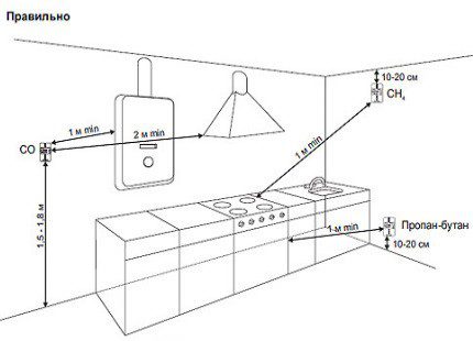 • Le dispositif de signalisation pour le propane, le butane est fixé à une distance de 10 à 20 cm du sol, car ces substances sont plus lourdes que l'air.