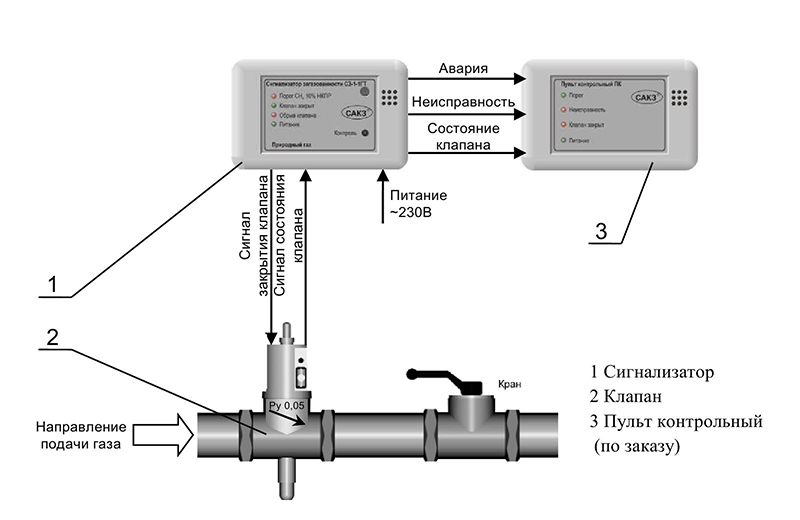 Une vanne de gaz normalement fermée se ferme en une seconde si l'alarme se déclenche ou si l'électricité de l'appartement est coupée. Dans cette position, il reste jusqu'à l'élimination des facteurs dangereux.