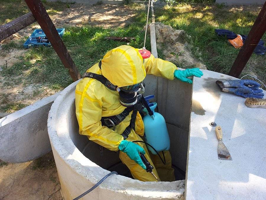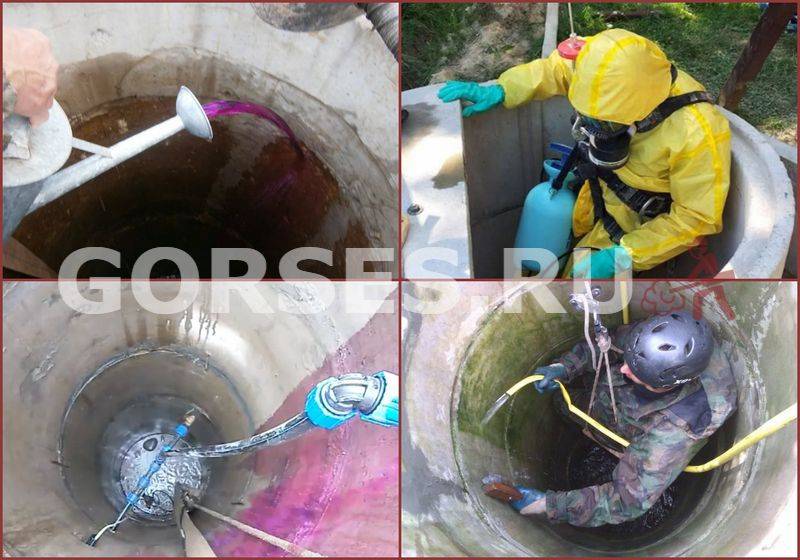 Pour le nettoyage, il faut d'abord pomper le liquide du puits. Ensuite, la mine doit être nettoyée des débris et des dépôts de boue. Au moyen d'un pulvérisateur ou d'un chiffon, la solution est appliquée sur les murs. Après 30 min. la surface est rincée. Ces agents de nettoyage comprennent : Aquatabs, comprimés Ecobriz, Septolit et autres.