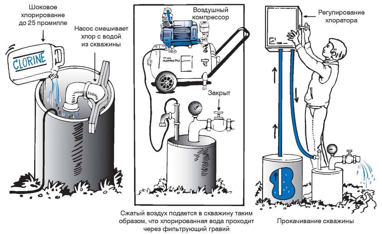 Il est nécessaire d'effectuer cette procédure de désinfection des puits afin que le soleil ne tombe pas sur la mine pendant cette période. Après une journée, le liquide est pompé, les murs sont soigneusement lavés, puis l'eau doit être à nouveau téléchargée. Répétez ceci jusqu'à jusqu'à l'odeur de chlore ne partira pas.