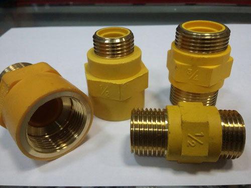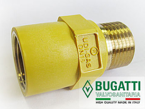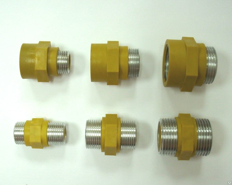 Pour créer une connexion détachable, des raccords combinés sont utilisés, qui sont d'une part une base en polypropylène, d'autre part - un fil métallique. Tout d'abord, un côté est soudé, puis l'équipement à gaz est connecté en vissant le raccord sur les bobines.