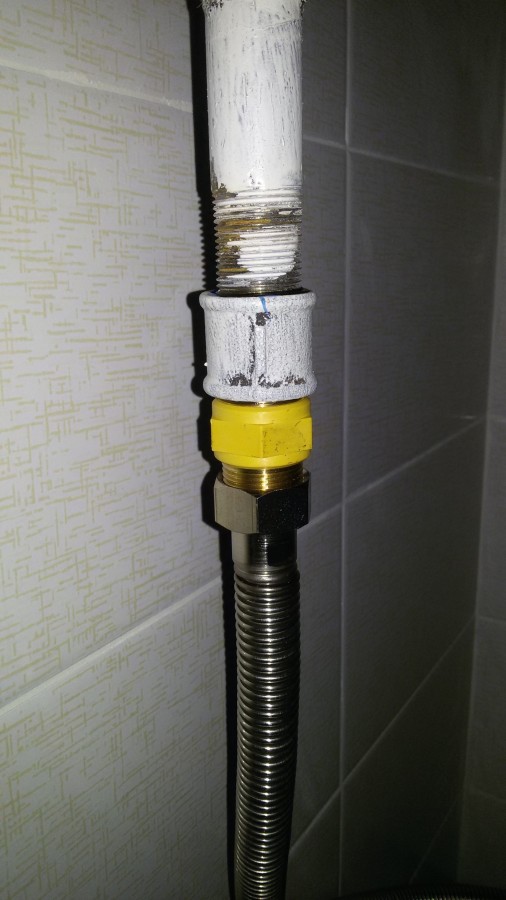 Nous enveloppons un scellant sur l'extrémité libérée du tuyau - un ruban fumigène et serrons soigneusement la connexion, d'abord avec une main, puis avec une clé. Nous vissons l'accouplement ou le «barillet» à la limite, en essayant de ne pas faire tomber le filetage et de ne pas déformer le boîtier diélectrique.