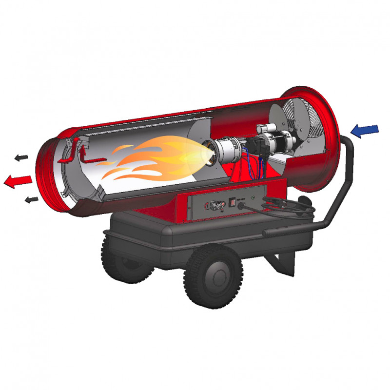 Pour une plus grande fiabilité, le brûleur et la chambre de combustion sont en acier inoxydable. L'air est fourni à hauteur de 800 m3/heure. Sa température de sortie peut atteindre 250°C. Le ventilateur consomme 230 W d'énergie électrique.