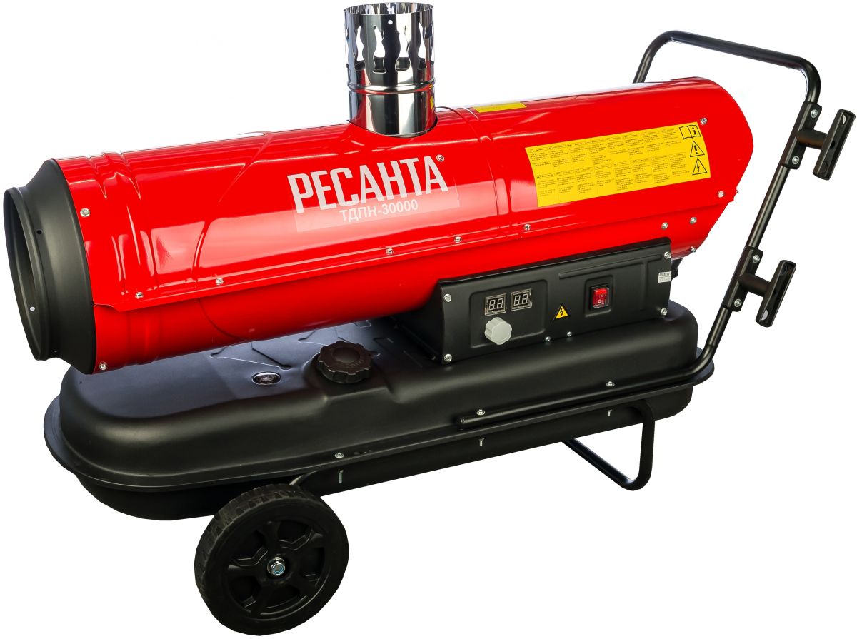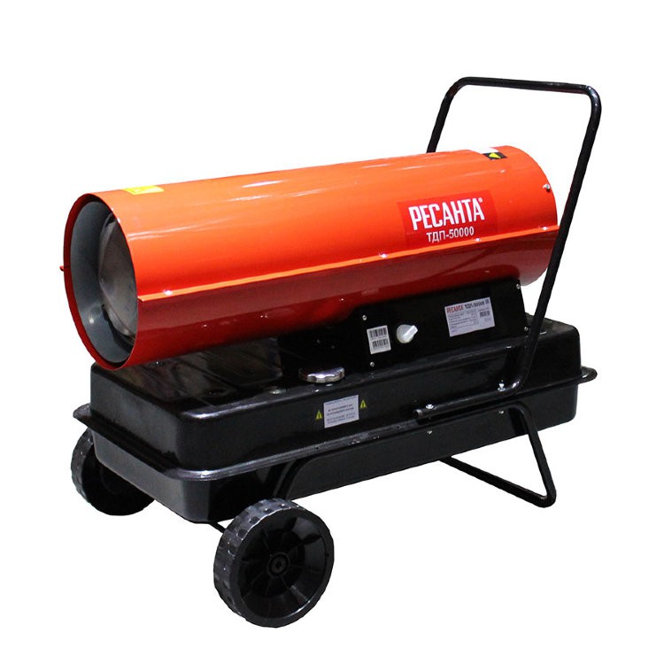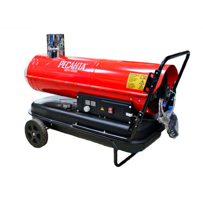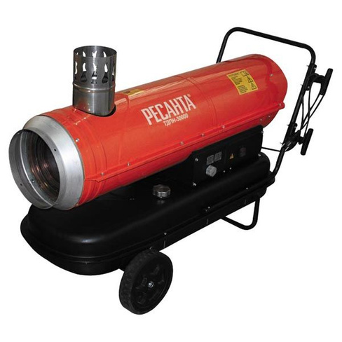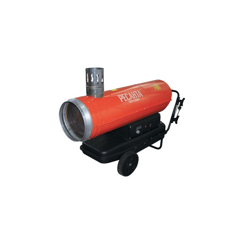 Resanta a présenté deux modèles de pistolets thermiques à combustion indirecte pour le choix des consommateurs - TDPN-50000 et TDPN-30000. La puissance de la première unité est de 50 kW avec une capacité allant jusqu'à 2000 mètres cubes. m/heure. Le réservoir de carburant contient 68 litres de carburant diesel, la durée de travail sur une station-service est de 17 heures (consommation 4 kg / heure). Dans la partie supérieure du corps, il y a un tuyau de dérivation pour connecter un tuyau de cheminée.