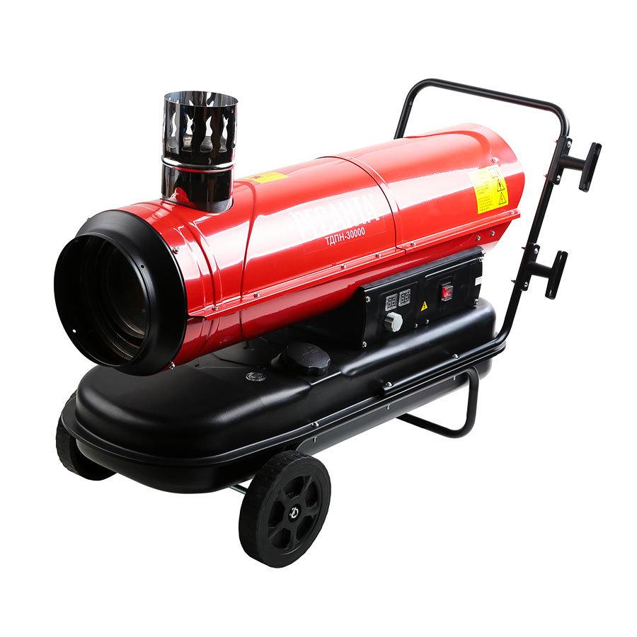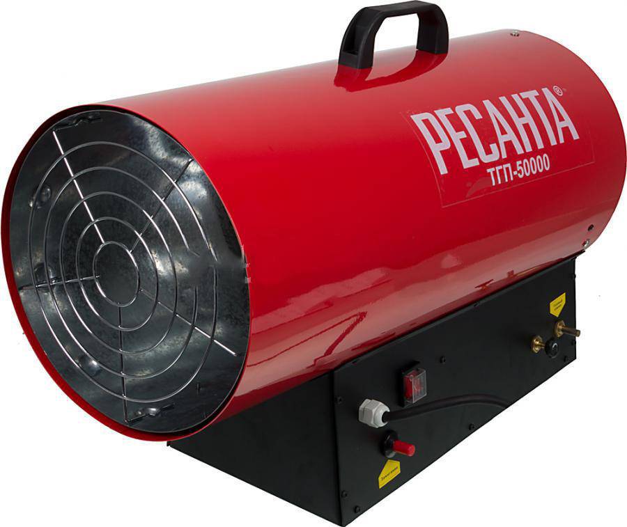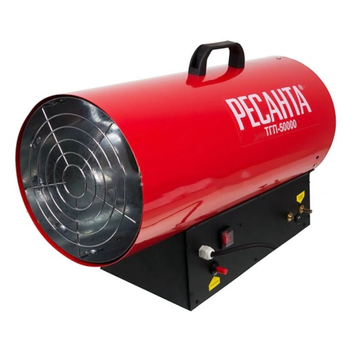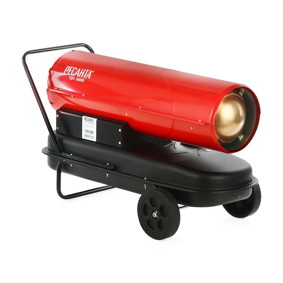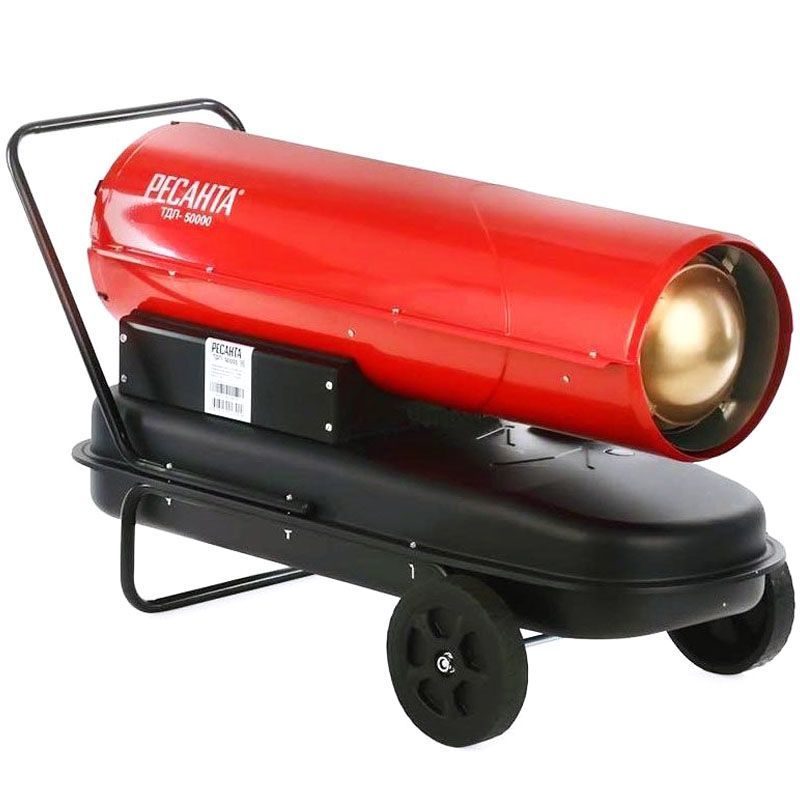 Resanta a présenté deux modèles de pistolets thermiques à combustion indirecte pour le choix des consommateurs - TDPN-50000 et TDPN-30000. La puissance de la première unité est de 50 kW avec une capacité allant jusqu'à 2000 mètres cubes. m/heure. Le réservoir de carburant contient 68 litres de carburant diesel, la durée de travail sur une station-service est de 17 heures (consommation 4 kg / heure). Dans la partie supérieure du corps, il y a un tuyau de dérivation pour connecter un tuyau de cheminée.