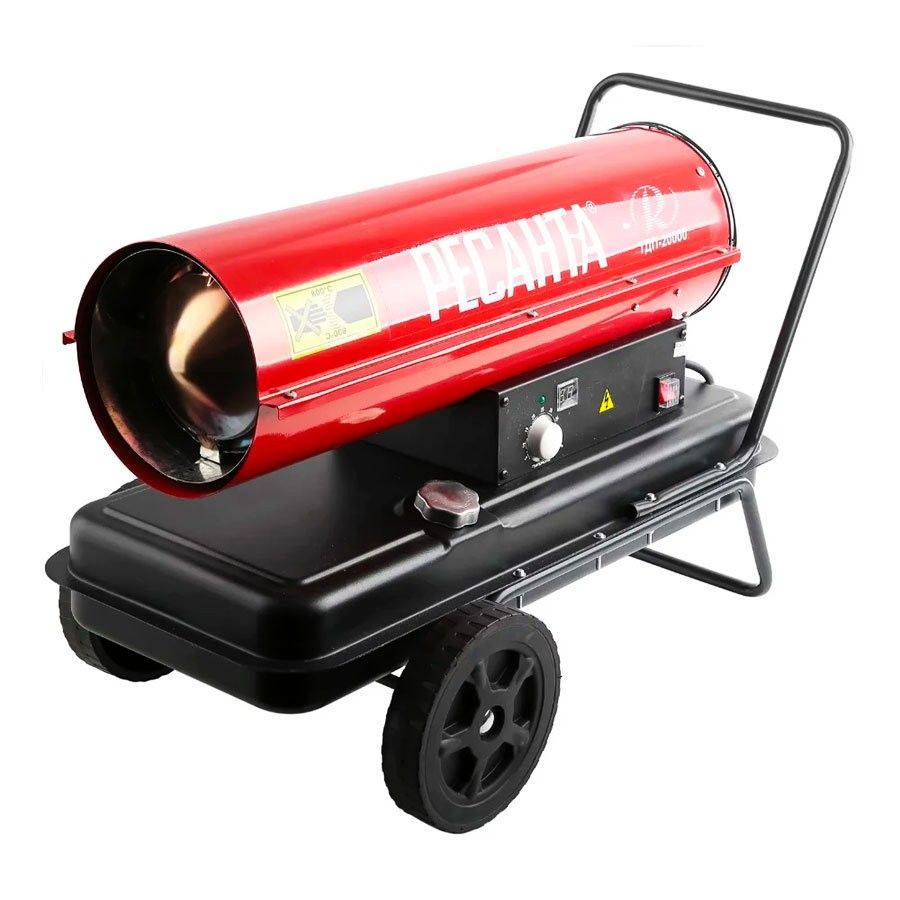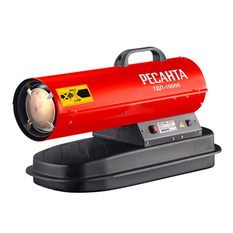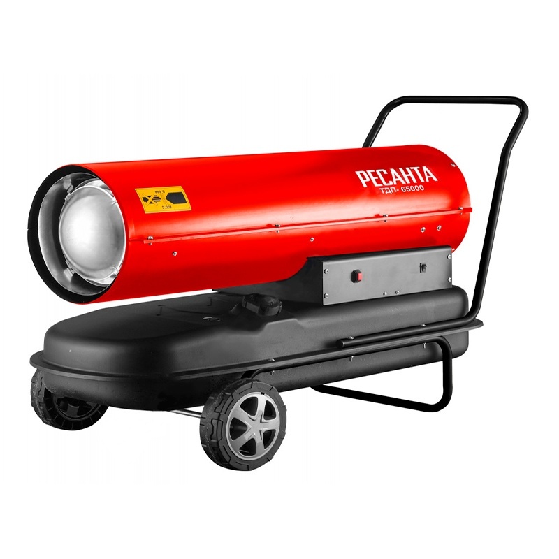 Le pistolet thermique diesel Resanta TDP-20000 est le modèle le plus économe en énergie. Sa puissance n'est que de 20 kW. Il est monté sur une base en métal avec des roues, un support et une poignée de transport, qui est un réservoir de carburant. La capacité du réservoir est de 24 litres. À un débit de 1,85 kg/h, cette quantité est suffisante pour environ 12 heures de fonctionnement. La puissance de l'unité est suffisante pour chauffer des pièces jusqu'à 200 mètres carrés. m avec une hauteur sous plafond ne dépassant pas trois mètres.