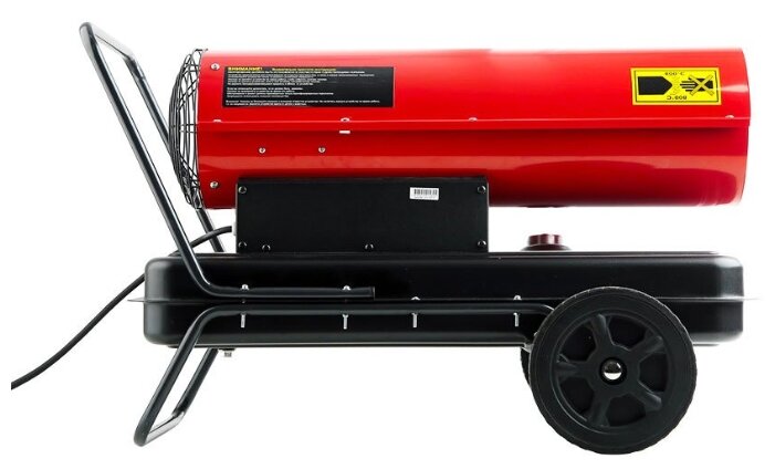 Cadre.Ce pistolet thermique est monté sur un chariot à deux roues avec une paire de poignées pour faciliter les déplacements. Un réservoir de carburant d'un volume de 43 litres est fixé par le bas. Le poids propre de l'unité est de 25 kg avec des dimensions de 1020x460x480 mm.