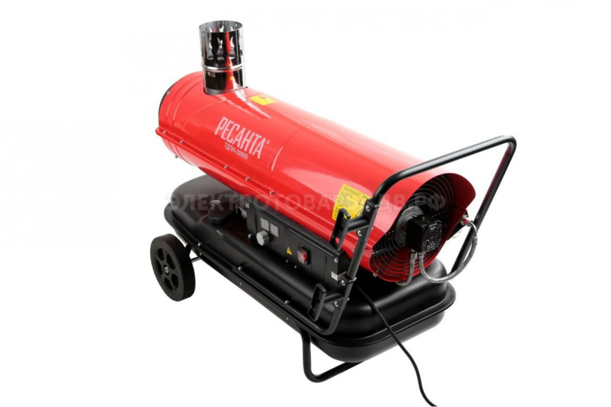 Devant nous se trouve une unité plus productive d'une puissance thermique de 30 kW. Sa productivité peut atteindre 735 mètres cubes par heure. Cela suffit pour le chauffage intensif des locaux à toutes fins. Il peut s'agir de garages, d'entrepôts, d'installations en construction et bien plus encore.Sur un ravitaillement du réservoir de carburant, le pistolet de Resanta peut fonctionner jusqu'à 8 heures. L'alimentation est nécessaire pour allumer la machine.