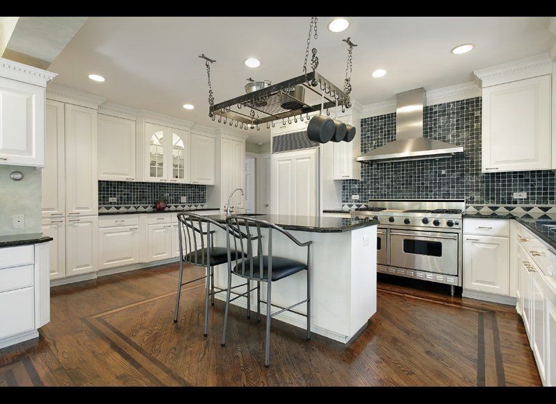 Au-dessus de l'îlot, des pots lumineux, des casseroles, des poêles à frire décorent la cuisine de leur éclat et de leurs couleurs.