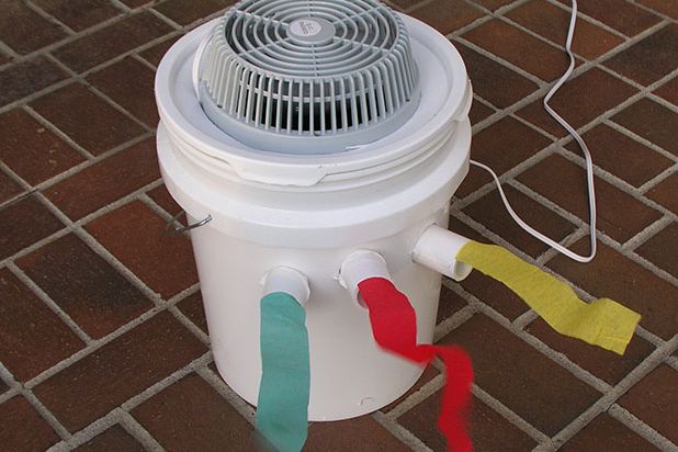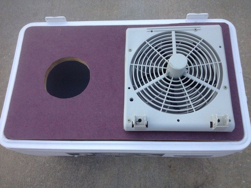 Installez un ventilateur et un col de tuyau en plastique sur le dessus du couvercle. Dessinez le contour avec un marqueur et découpez les trous correspondants.