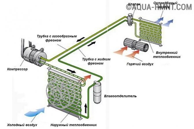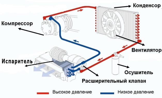 Le ventilateur génère des courants d'air qui soufflent autour du condenseur. Dans celui-ci, le fréon est soumis à un refroidissement et sa condensation se produit. L'air qui est soufflé à travers ce radiateur, au contraire, se réchauffe. La fonction principale du compresseur est de comprimer le fréon et de le maintenir en mouvement à l'intérieur du circuit de réfrigération.