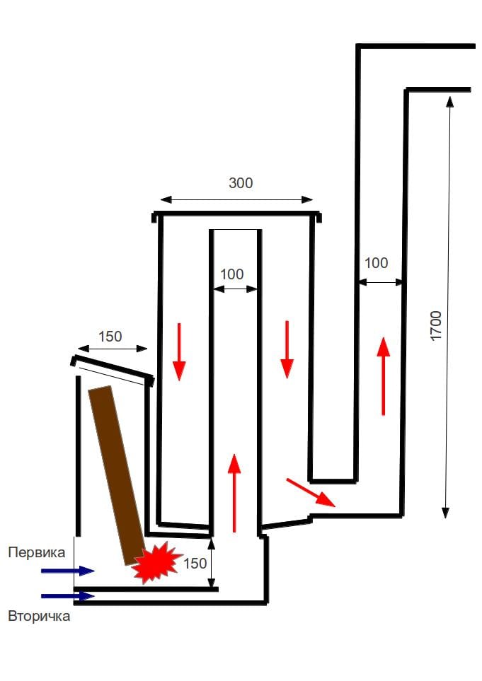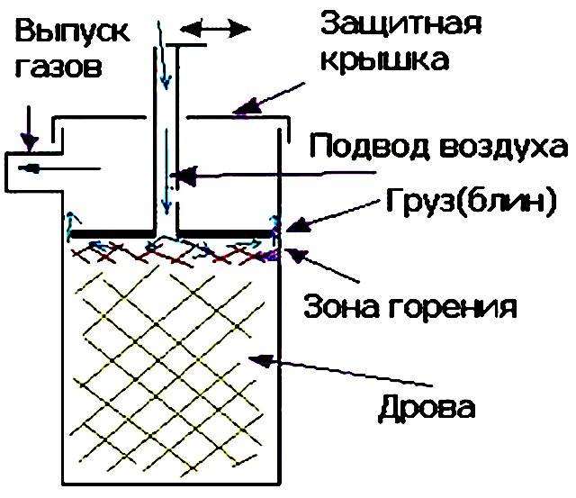 La principale caractéristique du dispositif de four à combustion longue est deux chambres. Le bois de chauffage est allumé dans l'un, les gaz sont brûlés dans le second. Dans certains modèles, la chambre de combustion est située dans la partie supérieure du corps et la deuxième chambre est située en dessous ou à travers la cloison. La combustion commence par les couches supérieures de combustible, puis le bois de chauffage descend. À l'aide de ventilateurs, de nouveaux flux d'air sont fournis.