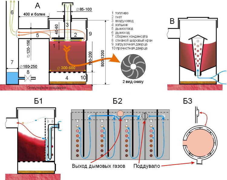 De tels appareils peuvent brûler du bois de manière habituelle ou par pyrolyse. Dans le premier cas, la combustion est réalisée en mode standard, avec évacuation des produits de combustion par la cheminée. Dans les fours à pyrolyse, il existe une chambre de post-combustion du combustible - elle brûle les produits de pyrolyse formés lors du chauffage et de la combustion du bois de chauffage dans la chambre principale. De tels fours ont un rendement plus élevé.