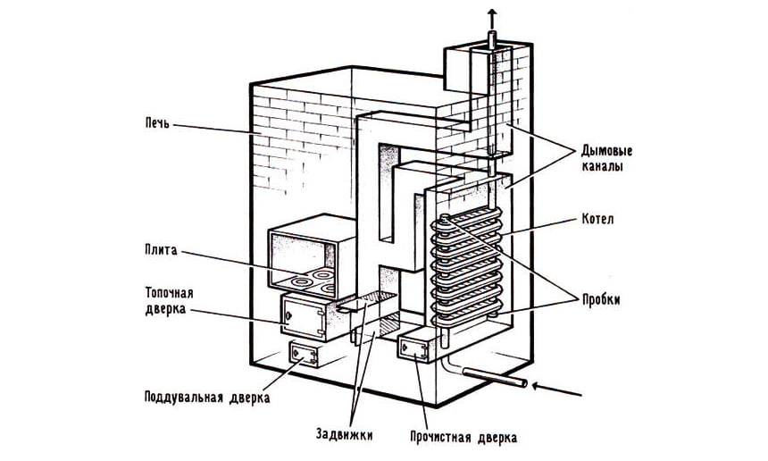 Toutes les mesures exactes doivent être indiquées sur le schéma. La cheminée doit nécessairement être amenée dans la rue. Le poêle à ventre peut être rond ou carré. Le volume du four dépend de la présence de grilles. Le schéma du poêle à ventre dépend de le matériel utilisé.