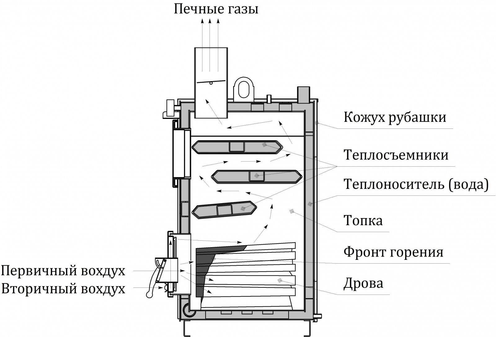 Une grande quantité de combustible solide est chargée dans le four en moyenne 1 à 2 fois par jour, cependant, certaines unités peuvent fonctionner pendant plusieurs jours. En régulant le flux d'oxygène dans la zone de combustion, une combustion lente se produit à des températures élevées. La fumée est évacuée par un tuyau spécial. Il passe à travers l'échangeur de chaleur et réchauffe l'eau pour le système de chauffage.Le chargement rapide du four assure un fonctionnement presque continu de l'appareil.