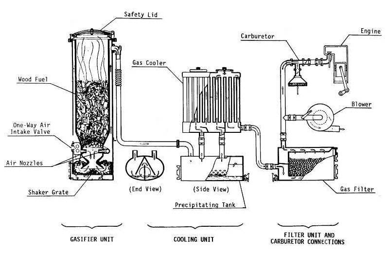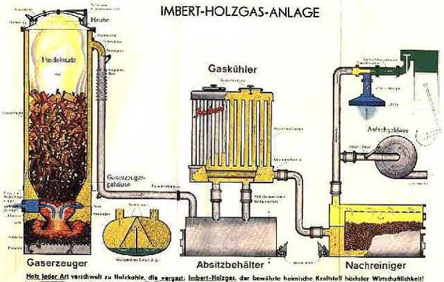 L'extraction de gaz à partir de bois de chauffage a été largement utilisée pendant la Seconde Guerre mondiale. Le combustible liquide est allé en première ligne, de nombreuses raffineries de pétrole détruites ont stimulé l'invention du gaz obtenu à partir du bois de chauffage.