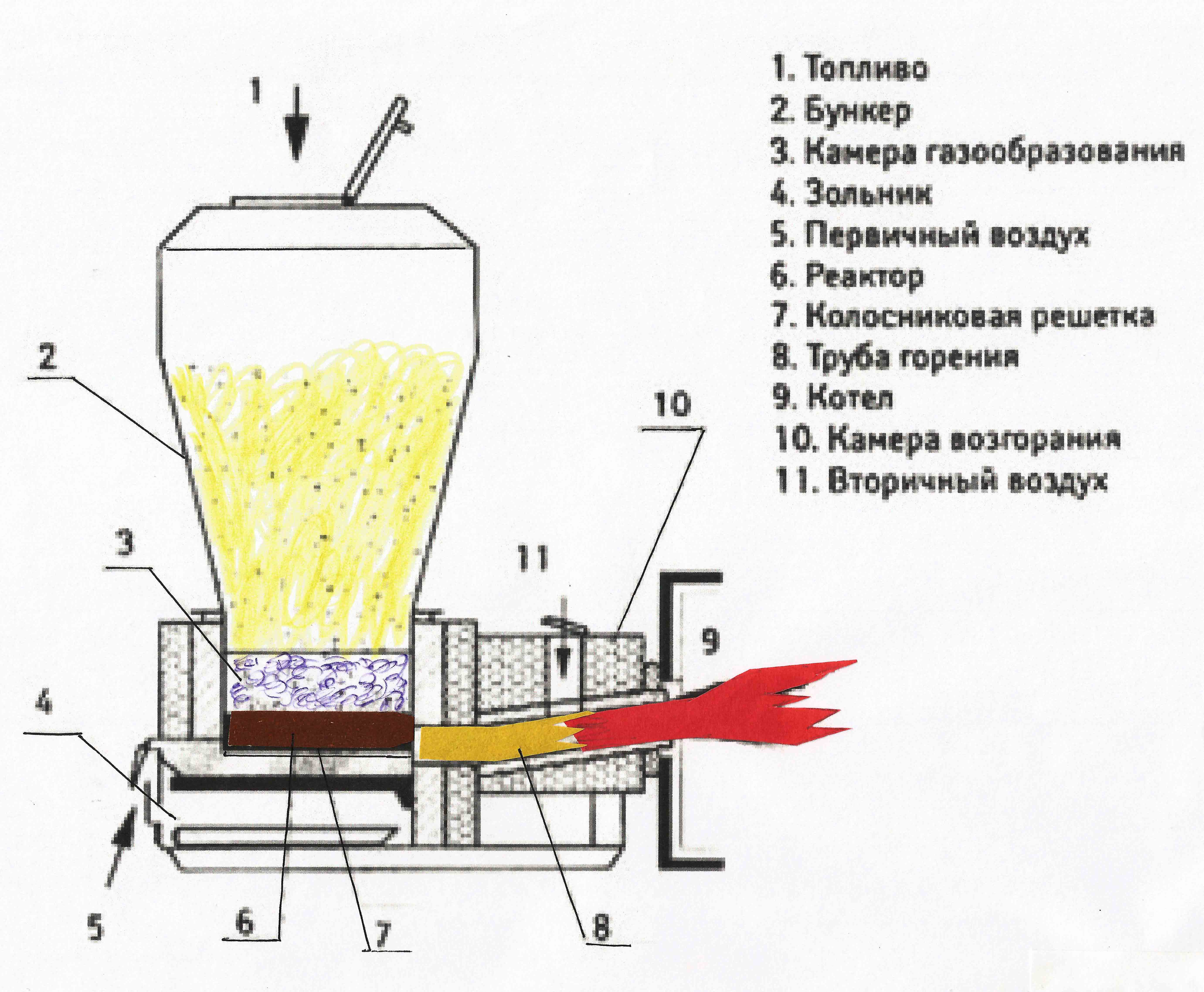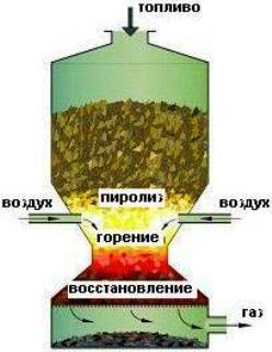 - Décomposition thermique du carburant. Le processus se déroule dans des conditions de carence en oxygène, qui n'est fourni au réacteur que par un tiers de ce qui est nécessaire pour une combustion conventionnelle.