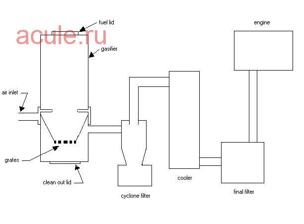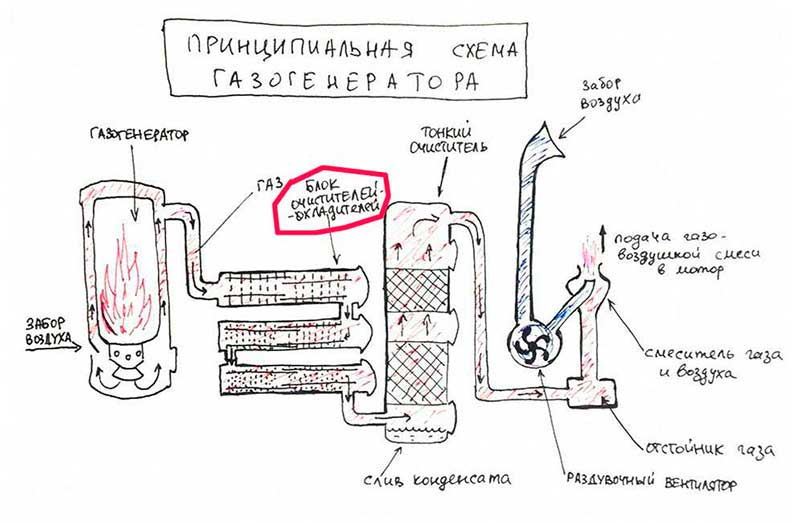 Après cela, tout doit être connecté en une seule structure. De la chaudière, le gaz doit s'écouler vers le radiateur de refroidissement, puis vers le Cyclone et le filtre fin. Et seulement après cela, le gaz résultant est fourni au moteur.