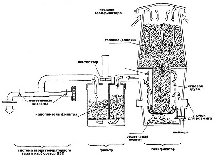 La technologie de production de gaz est simple. Le bois de chauffage est chargé dans le générateur de gaz, incendié. Une fois le bois de chauffage allumé, l'apport d'oxygène diminue, le bois de chauffage commence à couver, du monoxyde de carbone est libéré, qui monte chaud, pénètre dans le serpentin de refroidissement, est filtré à travers des filtres, le gaz refroidi et purifié pénètre dans la chambre de combustion du gaz. Le gaz combustible chauffe la pièce plus rapidement que le combustible solide.
