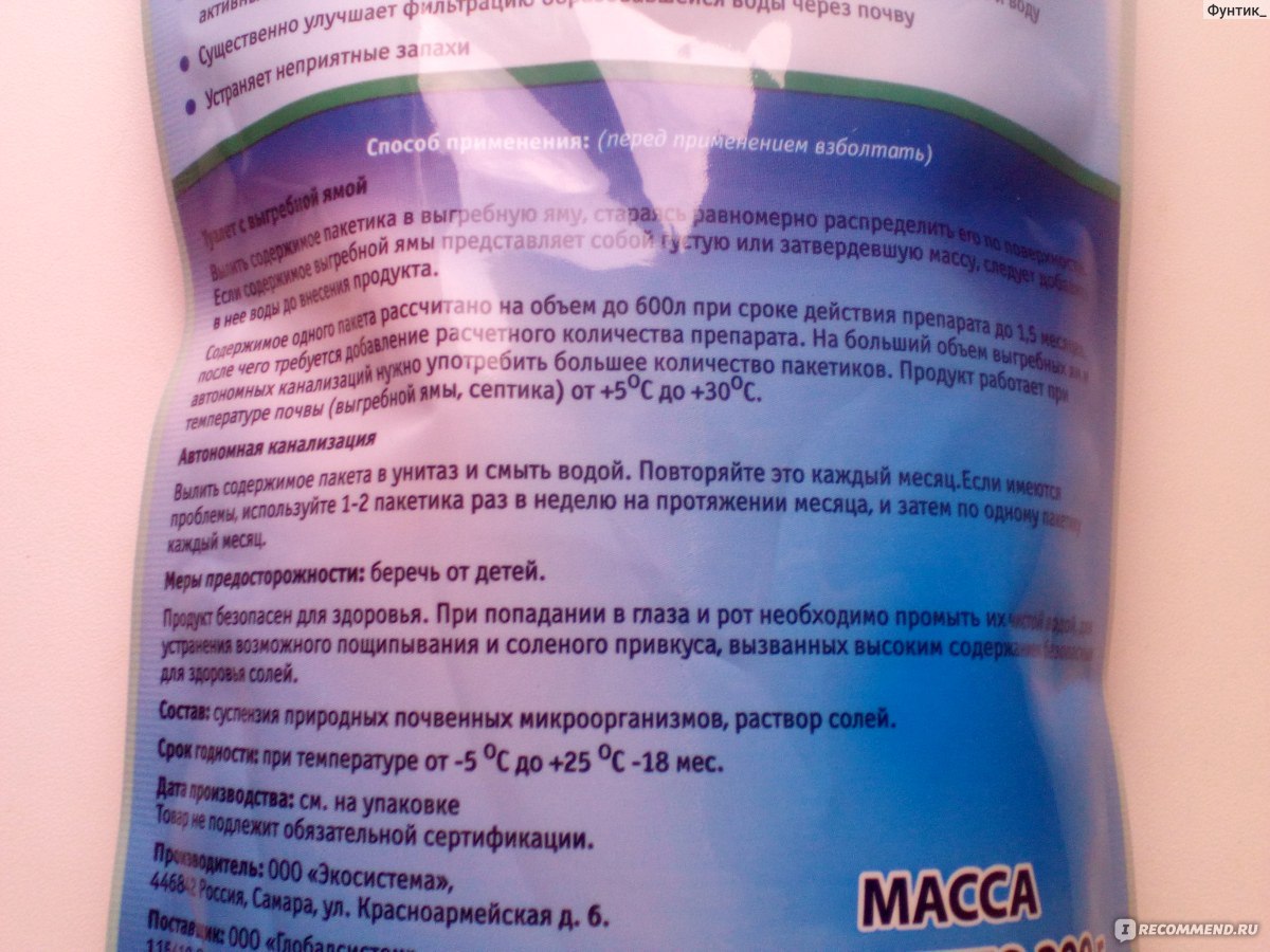 Un paquet de produit suffit pour nettoyer une fosse de 1,5 mille litres. La dose est valable un mois. Le forfait coûte 109 roubles.