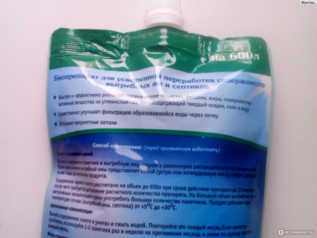 Le paquet est suffisant pour traiter une fosse d'un volume maximum de deux mètres cubes. Le médicament fonctionne de deux mois et demi à cinq mois. Le forfait coûte 570 roubles.