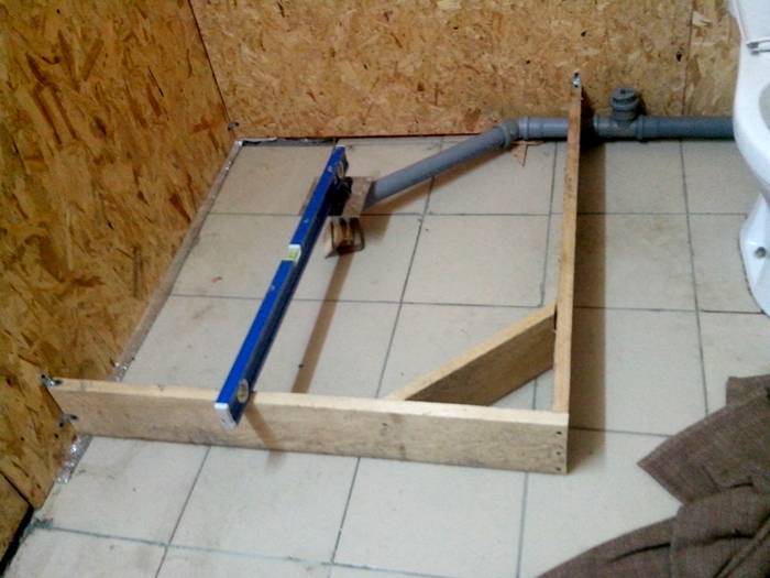 - Nous installons la palette, ajustons sa hauteur et son inclinaison. Il doit être incliné vers le drain.