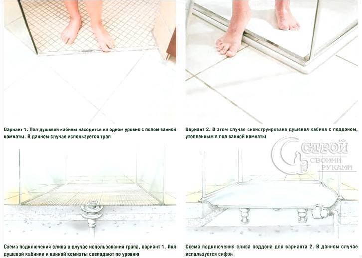 Après cela, nous mettons un drain avec un siphon, s'ils ne sont pas déjà installés en usine. Nous traitons les joints et les joints avec du mastic.
