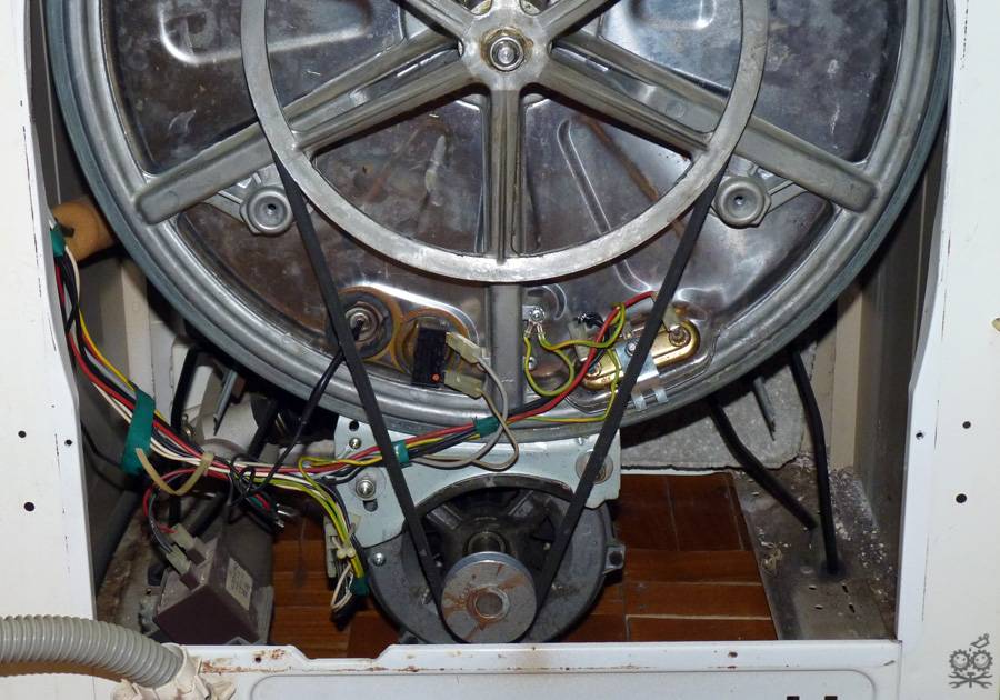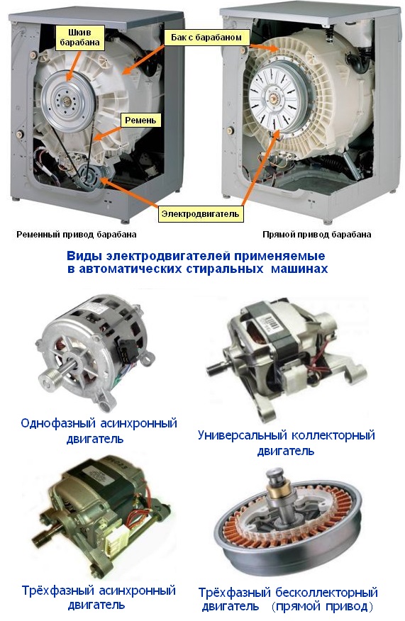 - Le moteur de la machine est responsable de la rotation du tambour, qui est relié via une courroie ou directement à la poulie du tambour. Le moment de démarrage et d'arrêt, ainsi que la vitesse de rotation, sont contrôlés par le module de commande.
