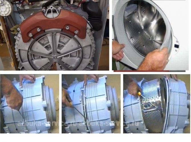 Le réservoir de la machine à laver se compose de deux parties reliées par des supports métalliques ou des boulons. L'eau est aspirée et évacuée par des tuyaux spéciaux reliés aux parois du réservoir. Pour réduire les vibrations qui se produisent lorsque le tambour tourne, la partie supérieure du réservoir est fixée au corps de la machine avec des ressorts et la partie inférieure à l'aide d'amortisseurs.