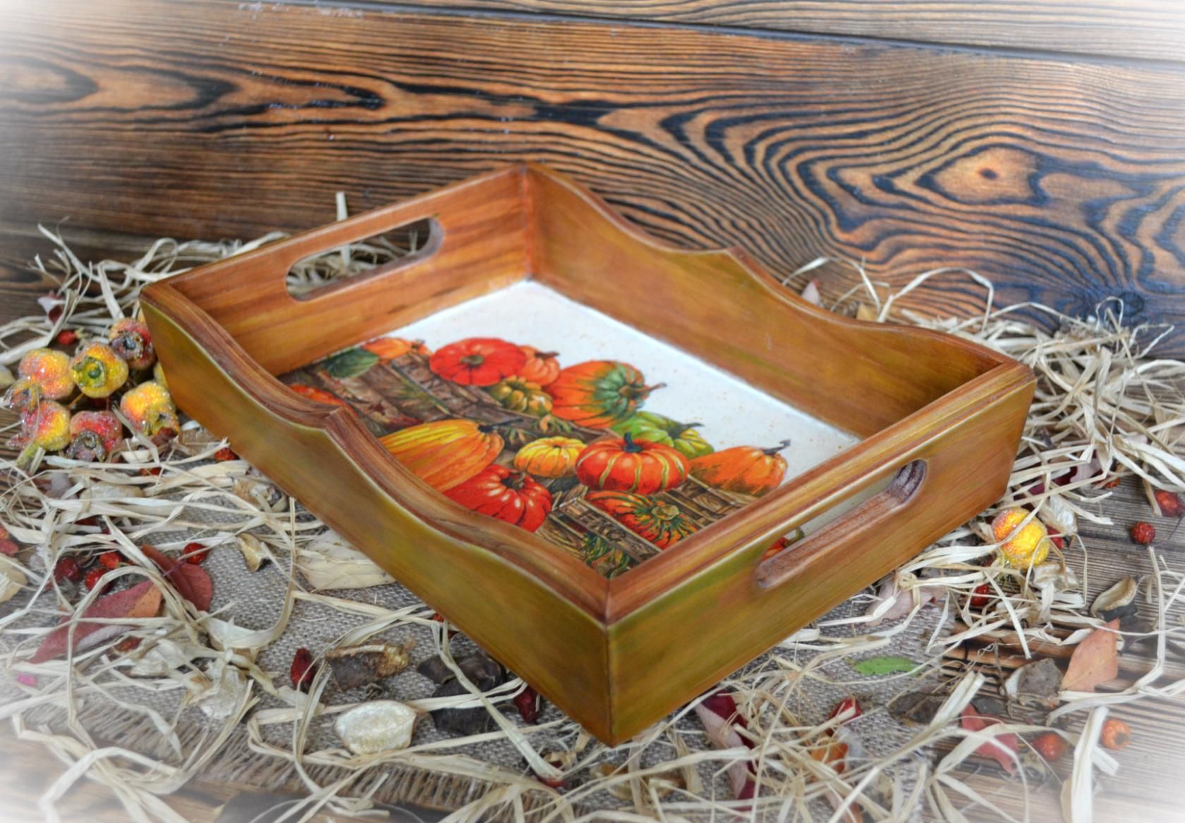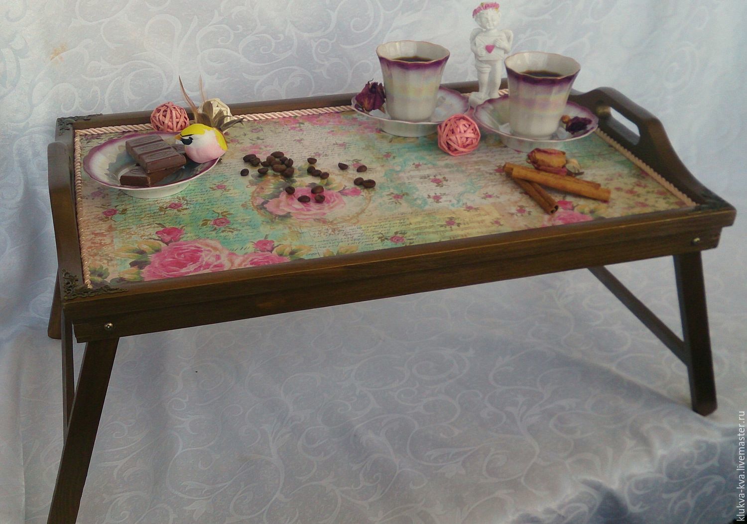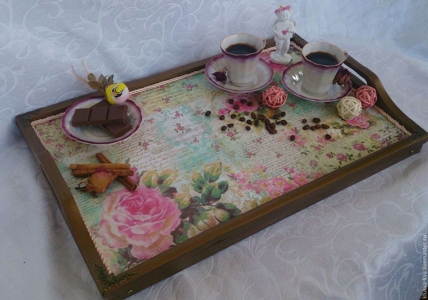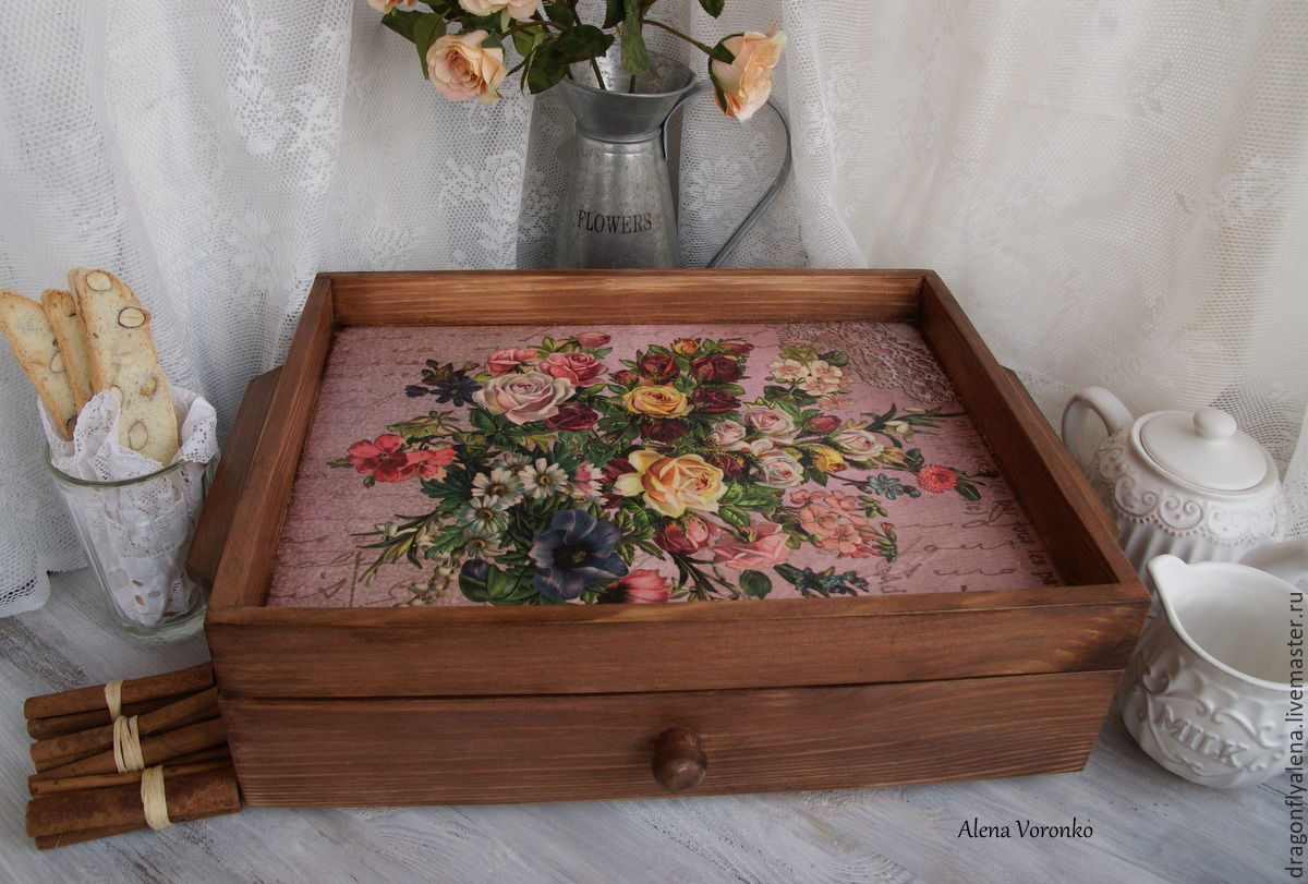 Sur la base de cette classe de maître, vous pouvez créer de beaux plateaux avec une variété de décors. Par exemple, vous pouvez réaliser un tel plateau de service avec un fond en ardoise, sur lequel vous pourrez écrire des notes romantiques à la craie.