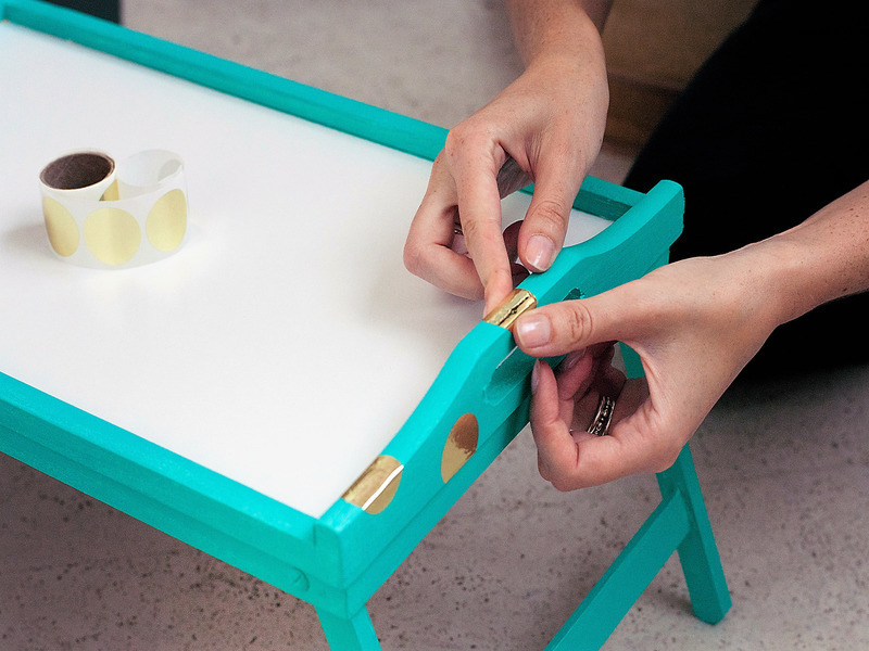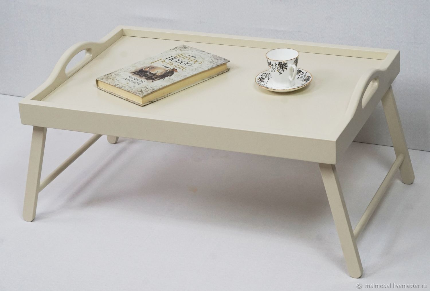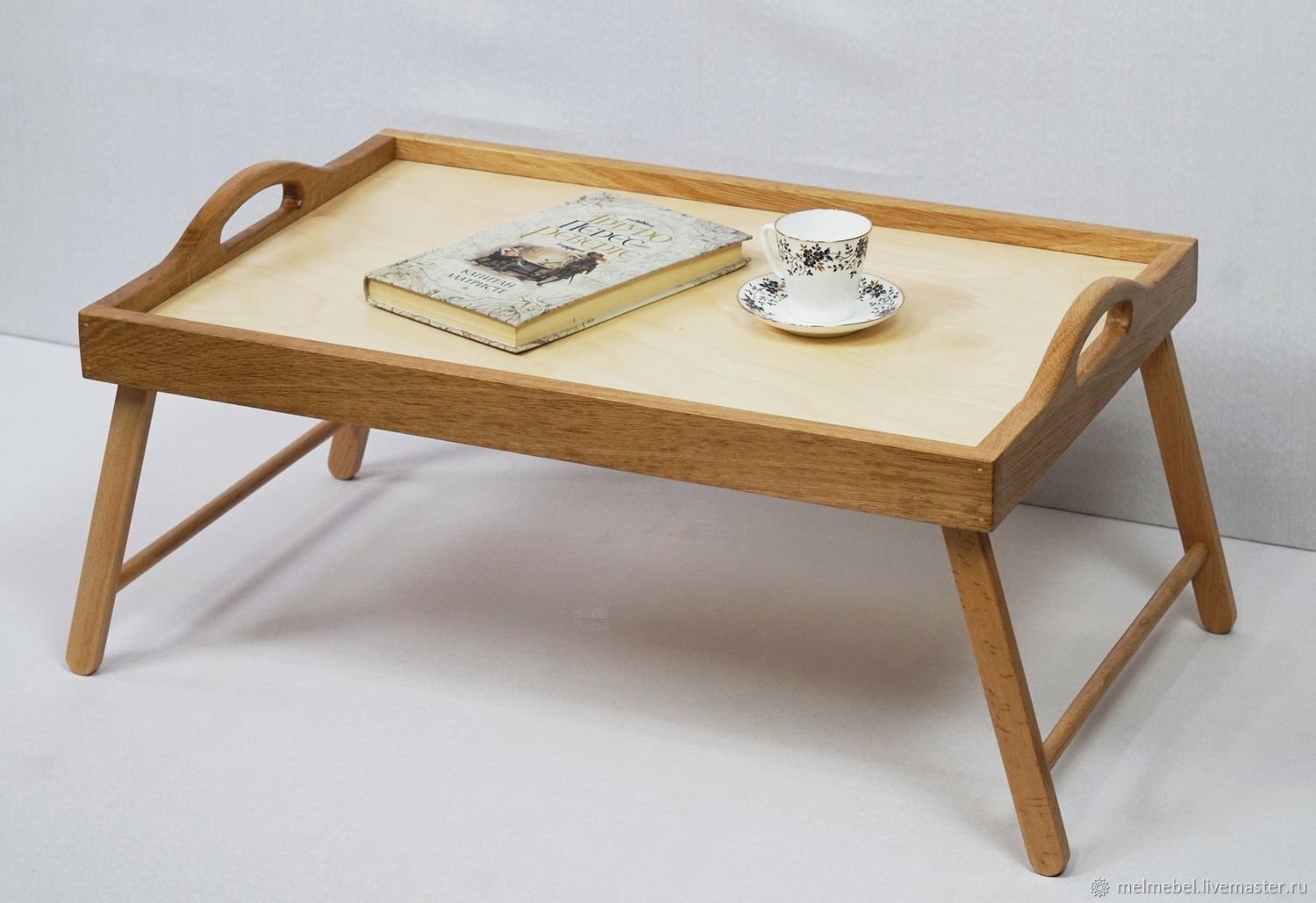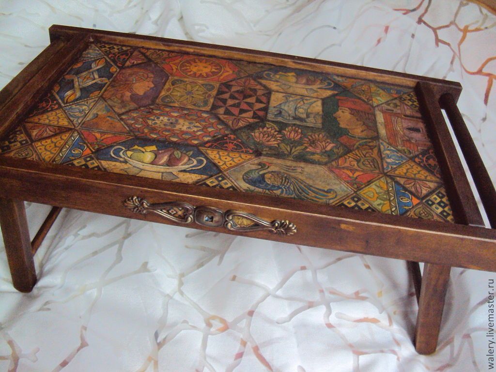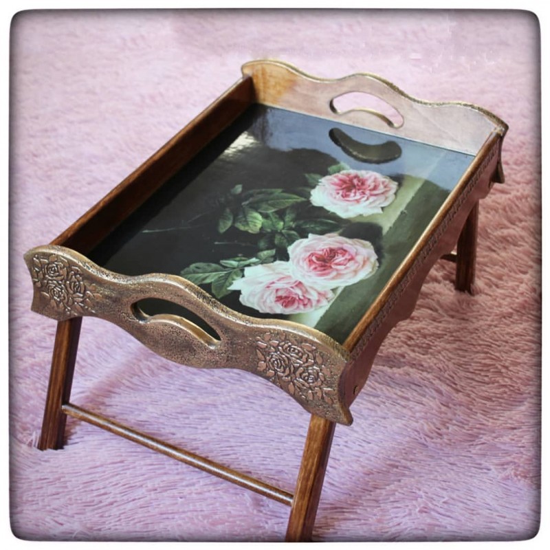 Pour plus de fiabilité et donner du poids à notre plateau (afin qu'il repose exactement sur une surface molle), il est préférable de le renforcer en plus par le bas. Pour ce faire, vous devez prendre du contreplaqué, y attacher un cadre, l'entourer le long du contour et le découper avec une scie sauteuse. La pièce résultante doit être poncée sur les bords, puis peinte dans une couleur appropriée (préalablement apprêtée). Une fois que le contreplaqué est sec, tout ce que vous avez à faire est de fixer le contreplaqué au cadre avec de petites vis, des clous, des vis autotaraudeuses ou une agrafeuse pour meubles. Un tel plateau résistera même au petit-déjeuner le plus lourd au lit.