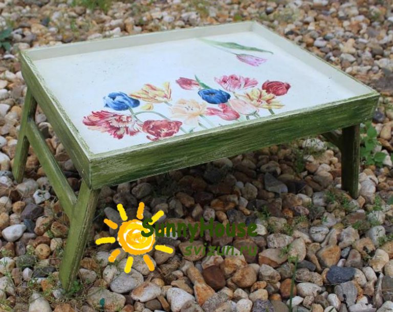 Tout d'abord, nous lubrifions le cadre avec de la teinture, une peinture agréable à l'œil. Ensuite, avec des vis autotaraudeuses, nous fixons les poignées sélectionnées sur les côtés du plateau prévu, et les têtes de vis saillantes doivent également être peintes pour correspondre au produit fait maison.