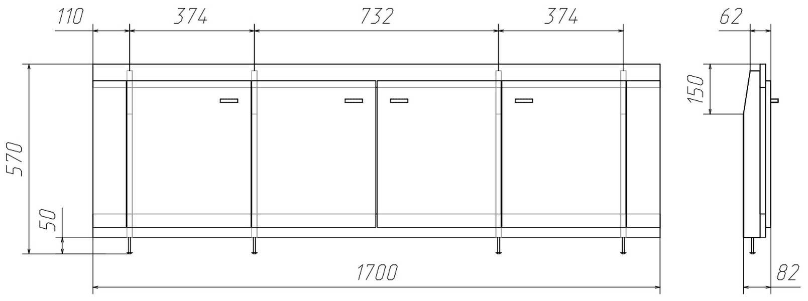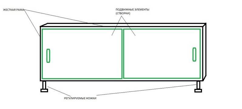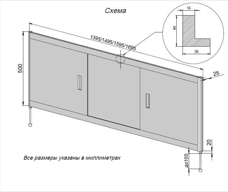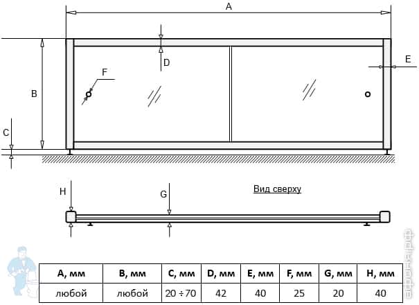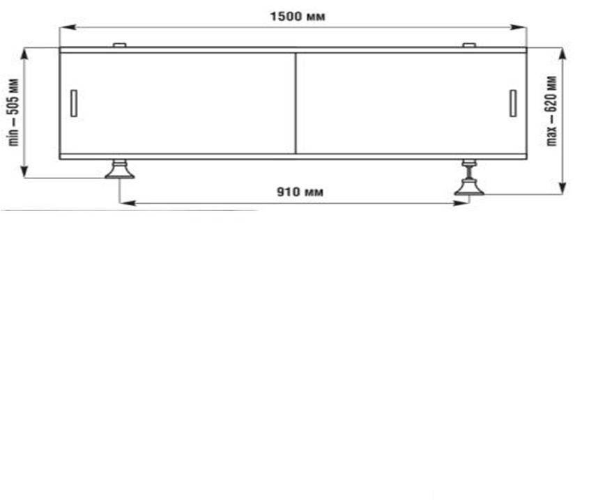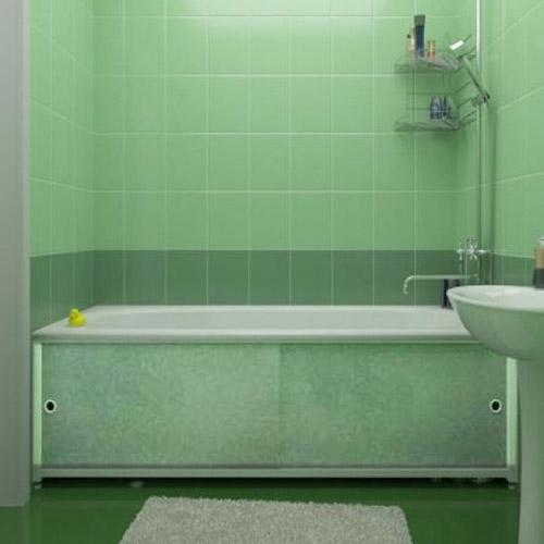 Le panneau coulissant est sélectionné individuellement pour chaque salle de bain. Le choix dépend de sa taille. Il existe deux options de conception sur la longueur de 1,5 et 1,7 mètre. Le nombre minimum de portes est de deux, avec une taille de 1,5 mètre. Dans certains cas, il y a quatre ailes. En hauteur, il y a des panneaux de 50,6 à 56 centimètres. Si vous le souhaitez, la hauteur peut être ajustée à l'aide des pieds.