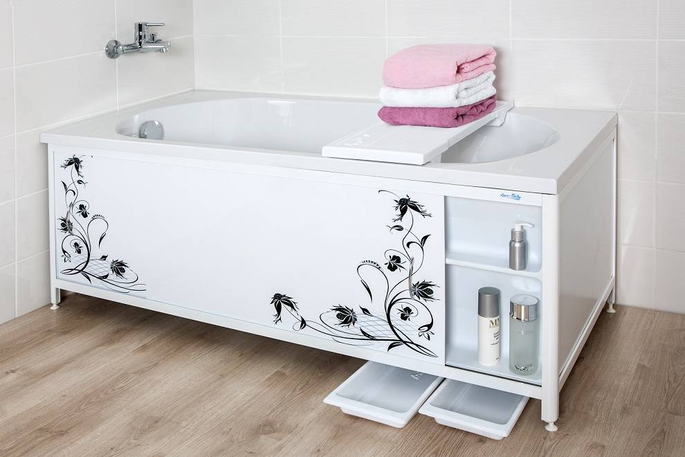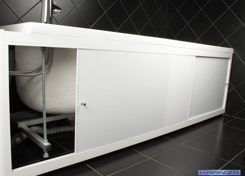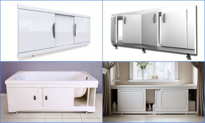 Les écrans coulissants sont les conceptions les plus avantageuses qui vous permettent de garder accessible l'espace sous la salle de bain, auquel cas les réparations peuvent être effectuées immédiatement. Dans le même temps, de nombreuses étagères seront un excellent endroit pour ranger les objets nécessaires: produits chimiques ménagers, restes de matériaux de construction après réparation, etc. De telles conceptions sont faciles à installer et à nettoyer, offrent une vaste sélection d'une grande variété de couleurs, mais elles sont un peu fragiles et l'expérience suggère qu'elles devront souvent être réparées.