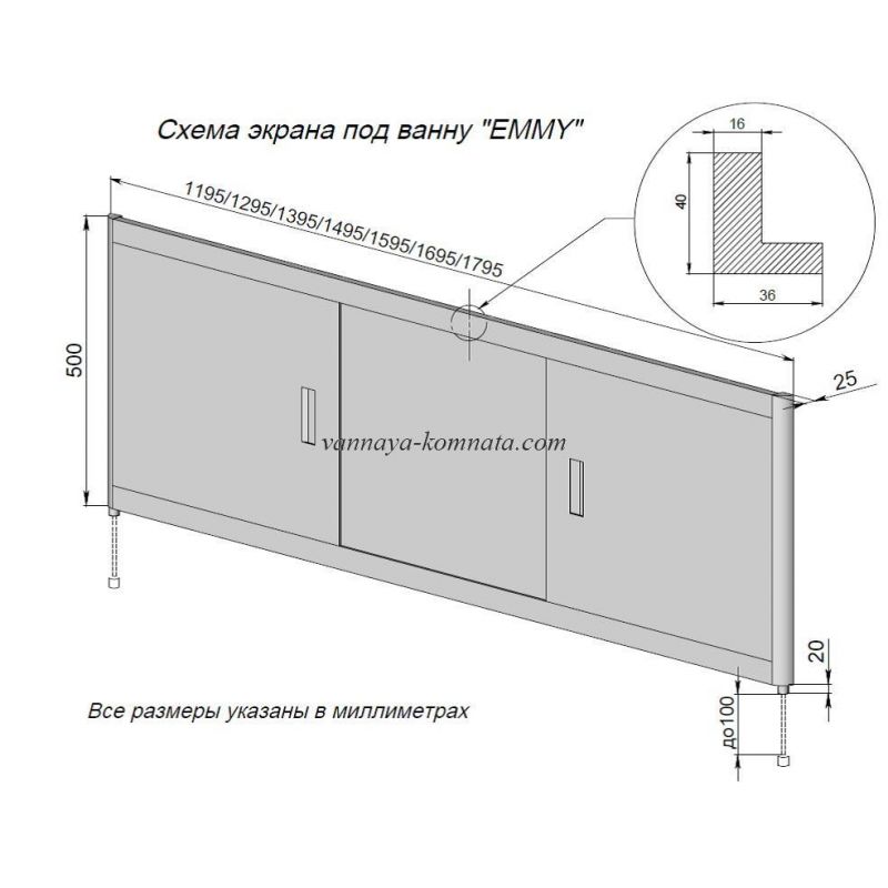 Les écrans de bain Emmy sont très durables et ont un design unique qui s'intégrera dans n'importe quel décor de salle de bain. Les armoires sont constituées d'un cadre en aluminium, tandis que les parois et les portes coulissantes sont en MDF laminé coloré. Les matériaux ne sont pas sujets à la pourriture, au développement de champignons et de moisissures, n'ont pas peur de l'humidité et de la vapeur. Les modèles du fabricant Emmy "Malibu" ont 3 portes coulissantes avec de belles poignées en métal. Les écrans de protection Emmy "Blanca" ont deux portes larges, il existe différentes tailles, tous les produits sont garantis 3 ans.