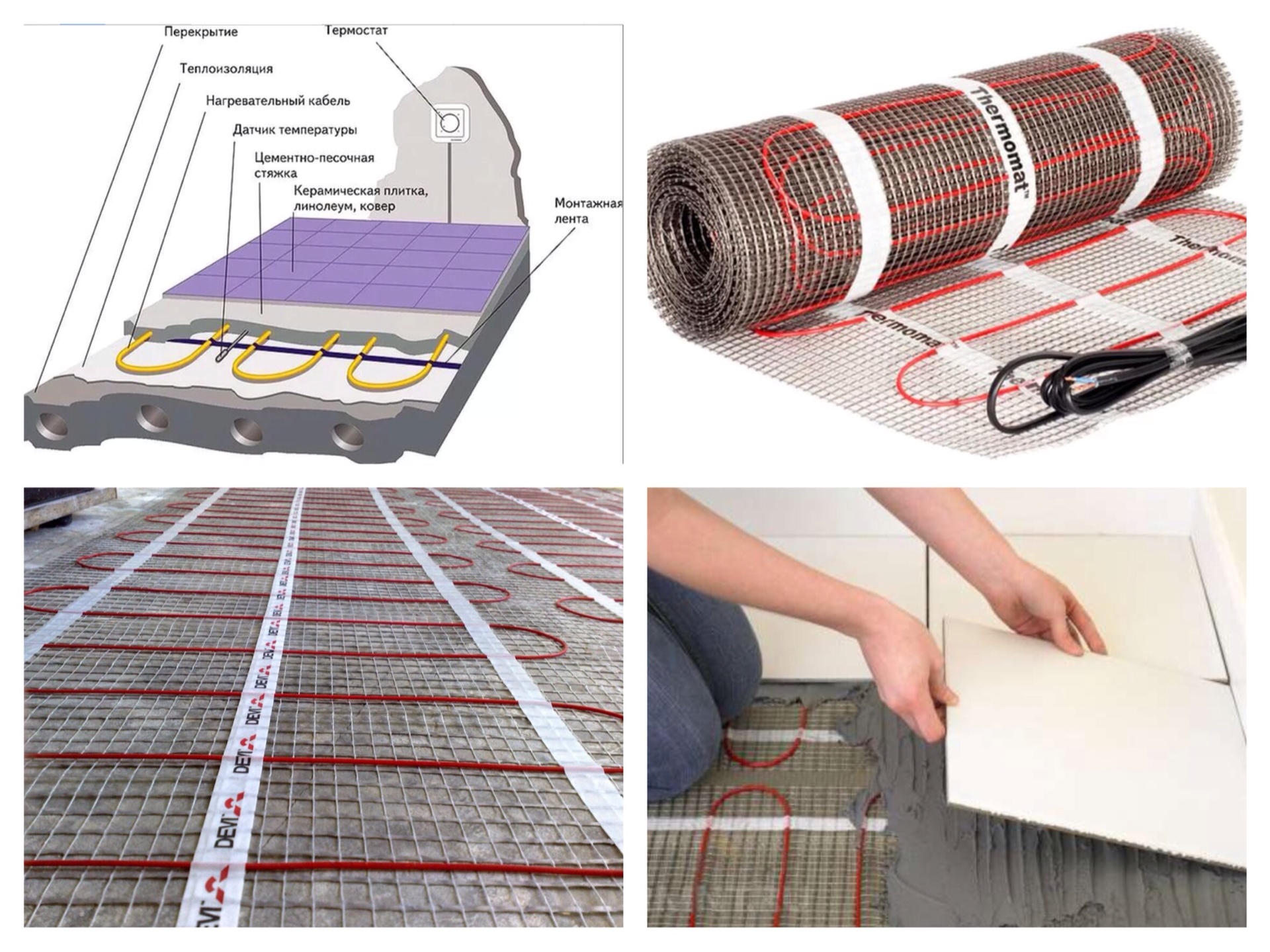 L'installation de thermomats sous la tuile est différente en ce sens qu'elle est posée sans isolation thermique. La pose sur d'anciens carrelages est également autorisée. Les planchers en tige sont posés sur une base en feuille. L'installation ultérieure est effectuée selon un schéma unique.