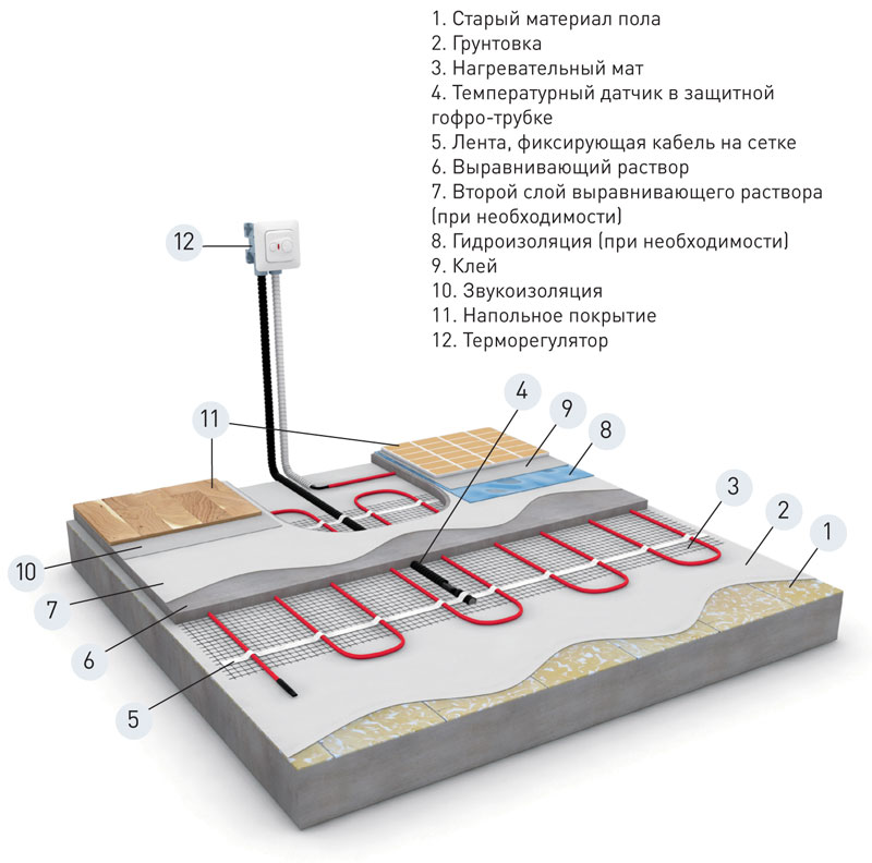 L'installation du chauffage au sol électrique commence la préparation de la base.Tout système est posé sur une surface plane et propre; si nécessaire, l'ancien revêtement est complètement démonté et le sol est nivelé avec une chape. Une couche de matériau d'étanchéité est posée sur la base avec un chevauchement sur le mur.