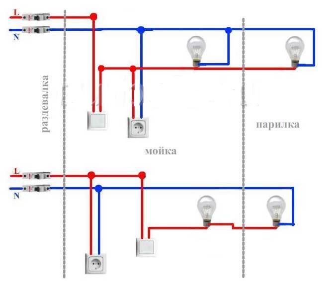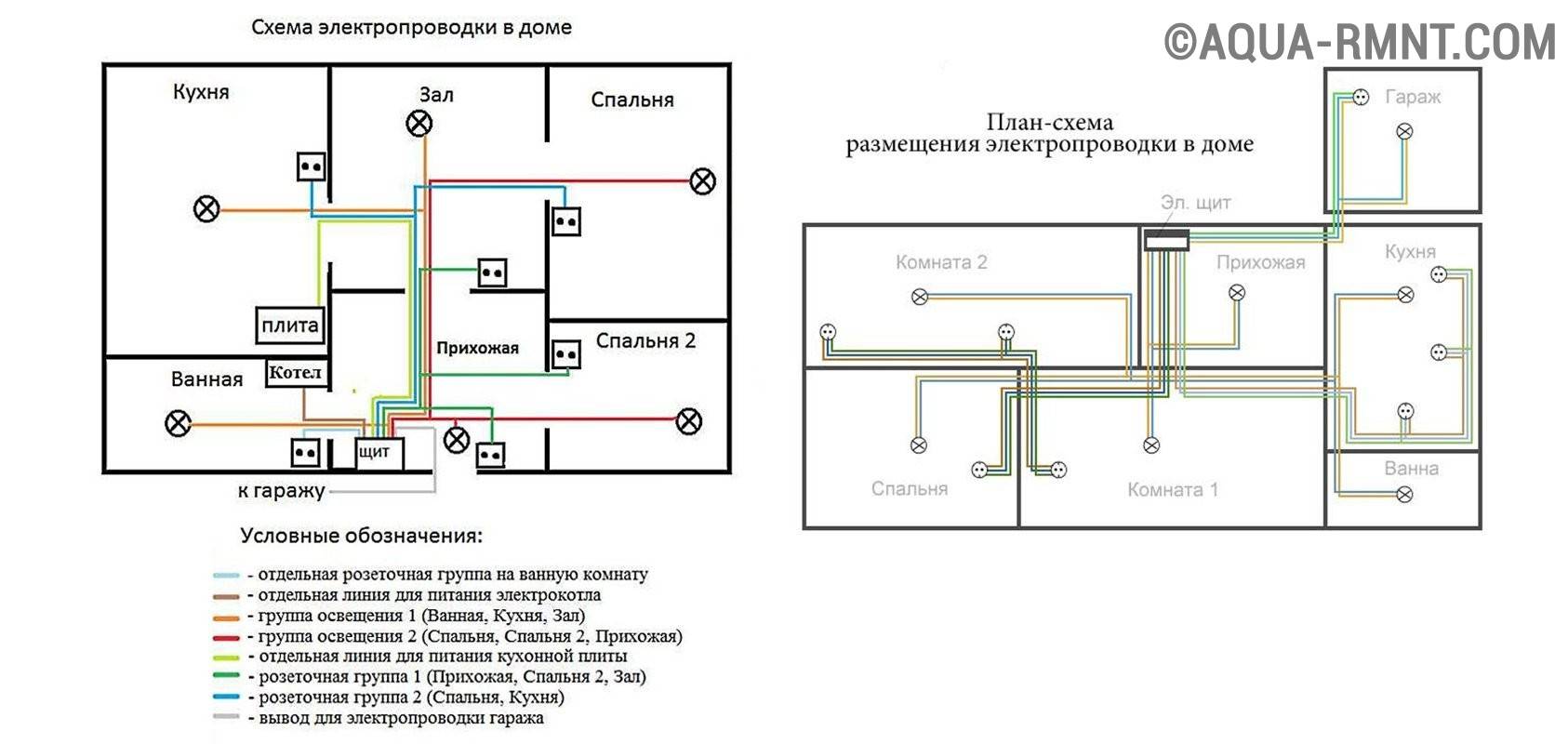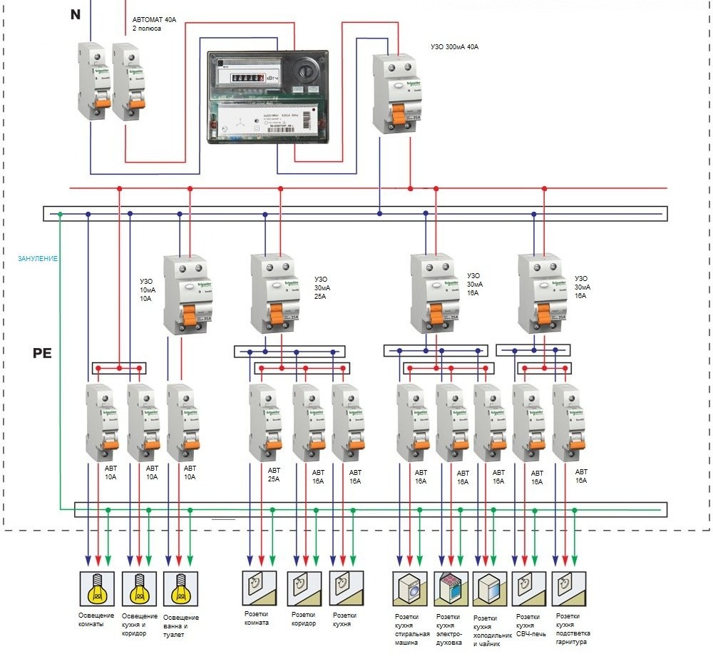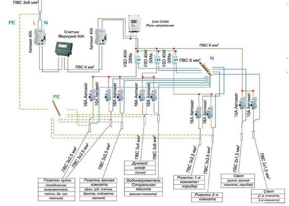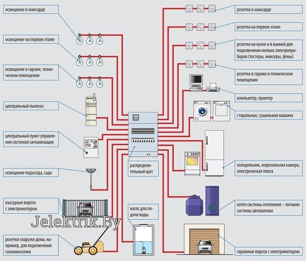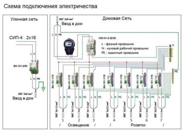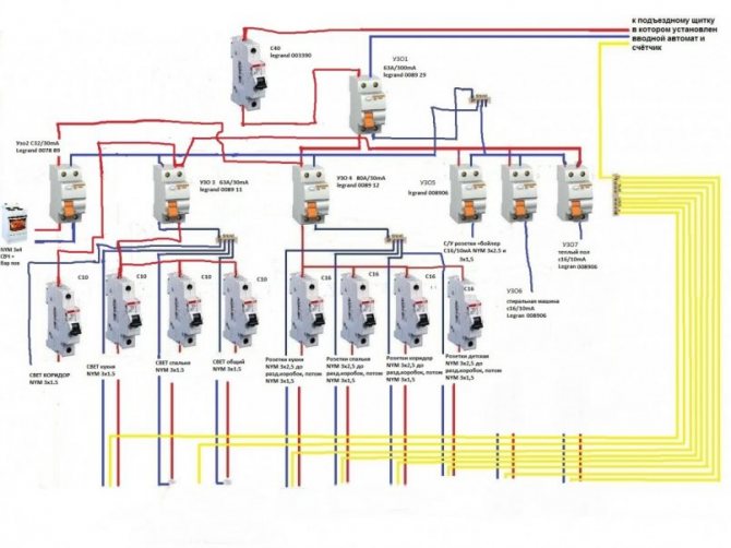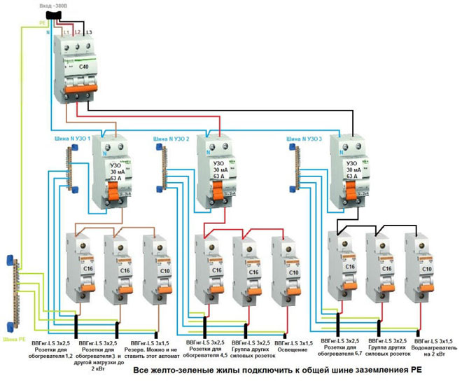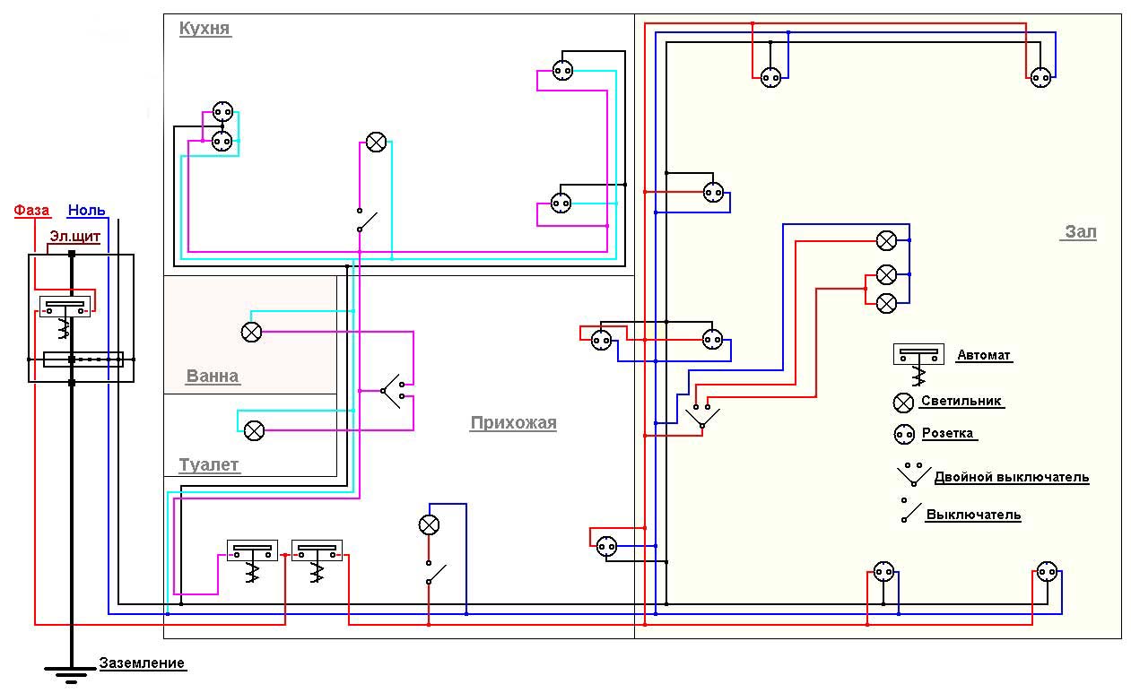 Des lignes électriques séparées sont le meilleur moyen d'assurer le fonctionnement sûr d'un réseau domestique.De ce fait, le nombre de jonctions potentiellement dangereuses est réduit, où l'oxydation et l'échauffement des contacts se produisent le plus souvent. Pour faciliter l'installation, chaque ligne du schéma est indiquée par sa propre couleur, indiquant la séquence de pose.