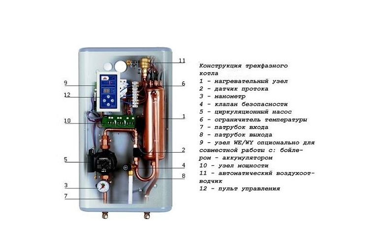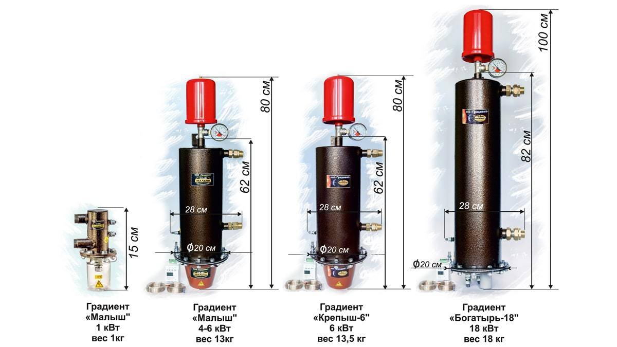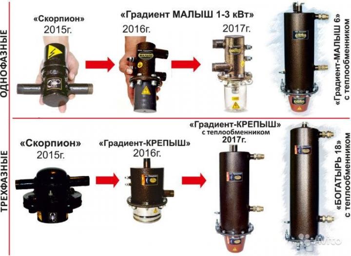 - Chaudières triphasées "Krepysh" 6-12 kW, "Bogatyr" 18 kW. avec échangeur de chaleur intégré.