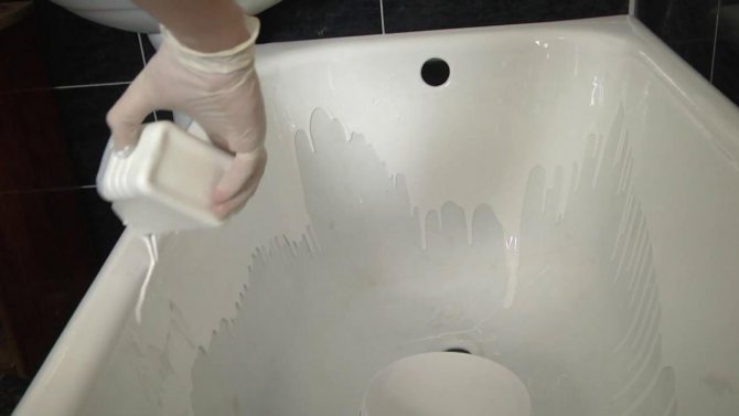 Une fois le liant ajouté à l'acrylique liquide (il est fourni avec le matériau lui-même), l'acrylique est appliqué sur les parois de la baignoire non pas avec un pinceau, mais en vrac. En termes simples, la solution est simplement versée à partir d'un petit récipient sur les bords du bain, ce qui lui permet de s'écouler vers l'intérieur. Après cela, l'acrylique est uniformément réparti sur toute la surface à l'aide d'une spatule en caoutchouc spéciale.