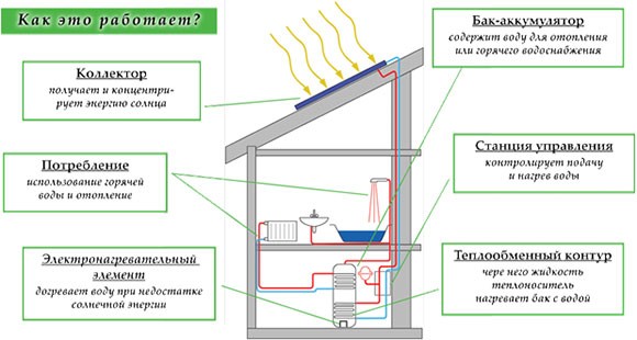 Les chauffe-eau solaires se composent de capteurs solaires, qui sont généralement installés sur le toit de la maison, d'un réservoir de stockage (généralement situé dans le sous-sol ou la buanderie) et de tuyaux qui les relient. Le fluide caloporteur (eau ou antigel non toxique (propylène glycol)) est mis en circulation par une pompe à travers les capteurs solaires, où il est chauffé par le soleil. Ensuite, il retourne au réservoir, où, à travers un échangeur de chaleur, la chaleur est transférée à l'eau d'un autre réservoir, à partir duquel elle est utilisée dans la maison.