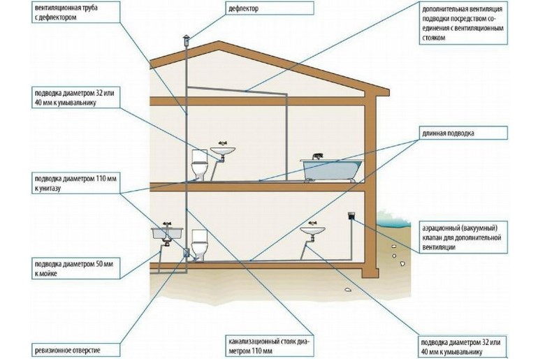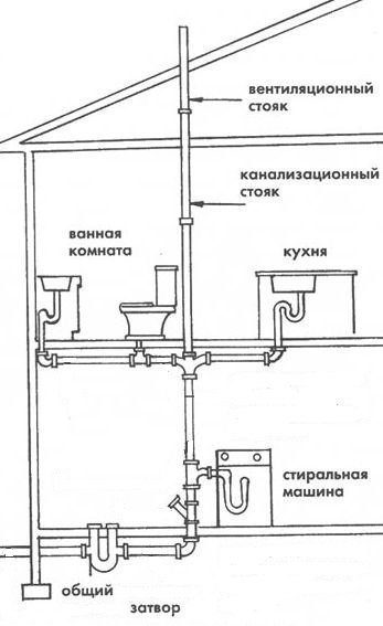 Avec une décharge brutale d'un grand volume d'eau dans une canalisation de petite section, les tuyaux se cassent souvent, coup de bélier. Par conséquent, un tuyau d'égout dans une maison privée fait partie intégrante des réseaux d'ingénierie internes. En raison de son utilisation, le système d'égouts d'une maison privée a un débit d'air supplémentaire et, en outre, la conception élimine les chutes de pression.