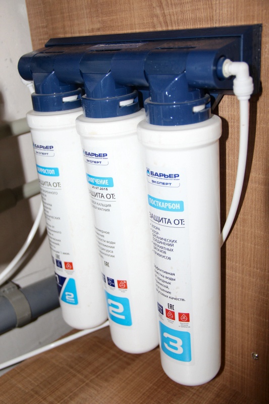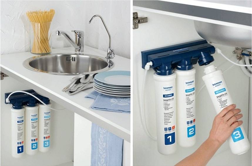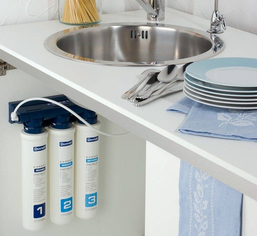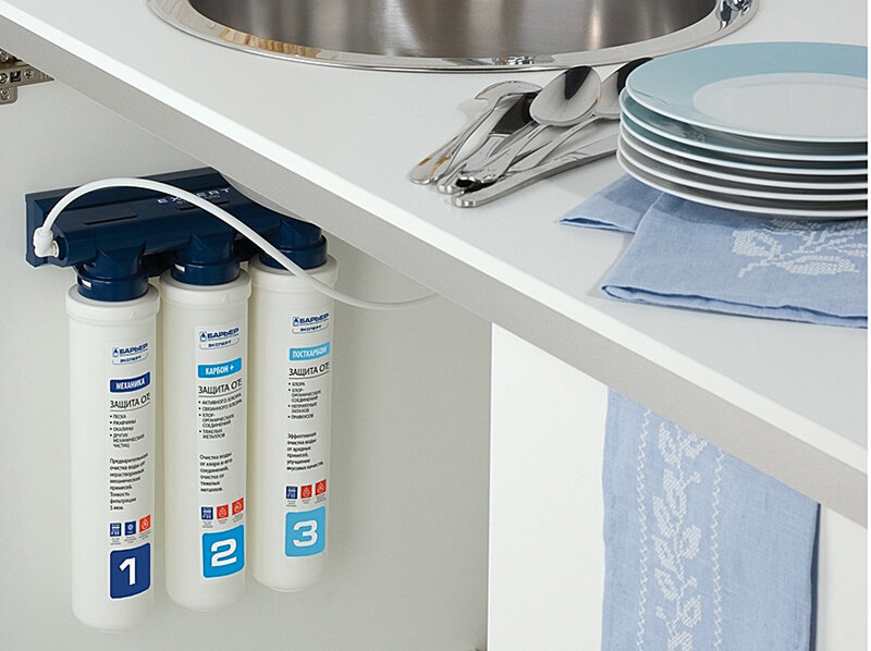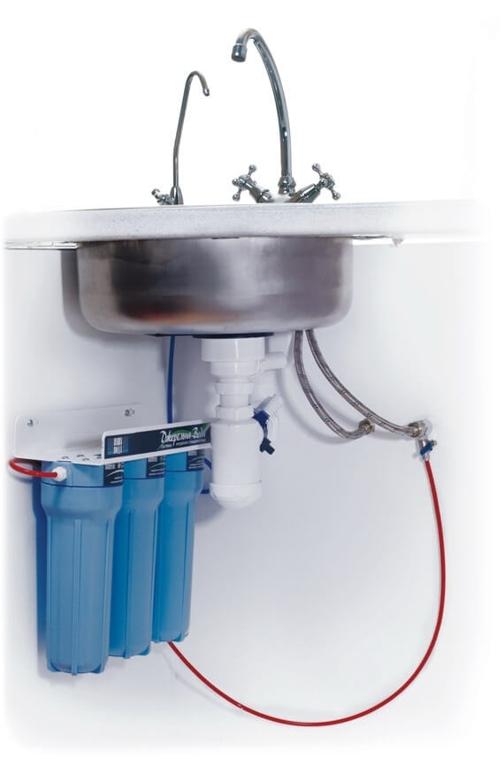 - le filtre "à côté de l'évier" est également facile à installer, se connecte à l'alimentation en eau à l'aide d'un adaptateur spécial et fournit un niveau moyen de purification, débarrassant l'eau des gros contaminants et des odeurs désagréables ;