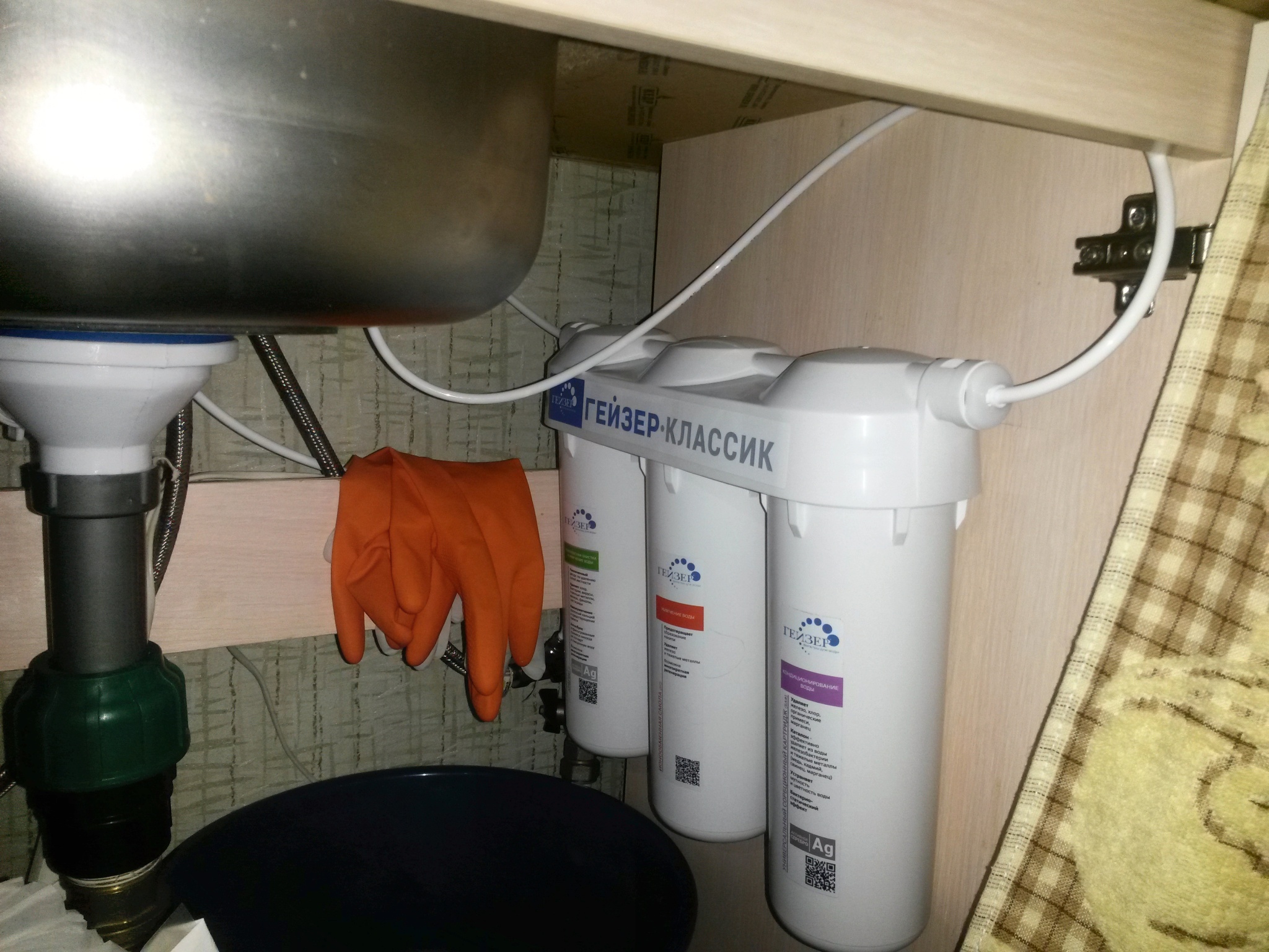 La première tâche consiste à trouver un endroit où se tiendra le système de filtration du liquide potable. Pour la zone sous l'évier, vous aurez besoin d'un récipient (vasque ou similaire) et d'une serviette qui absorbe bien l'humidité.