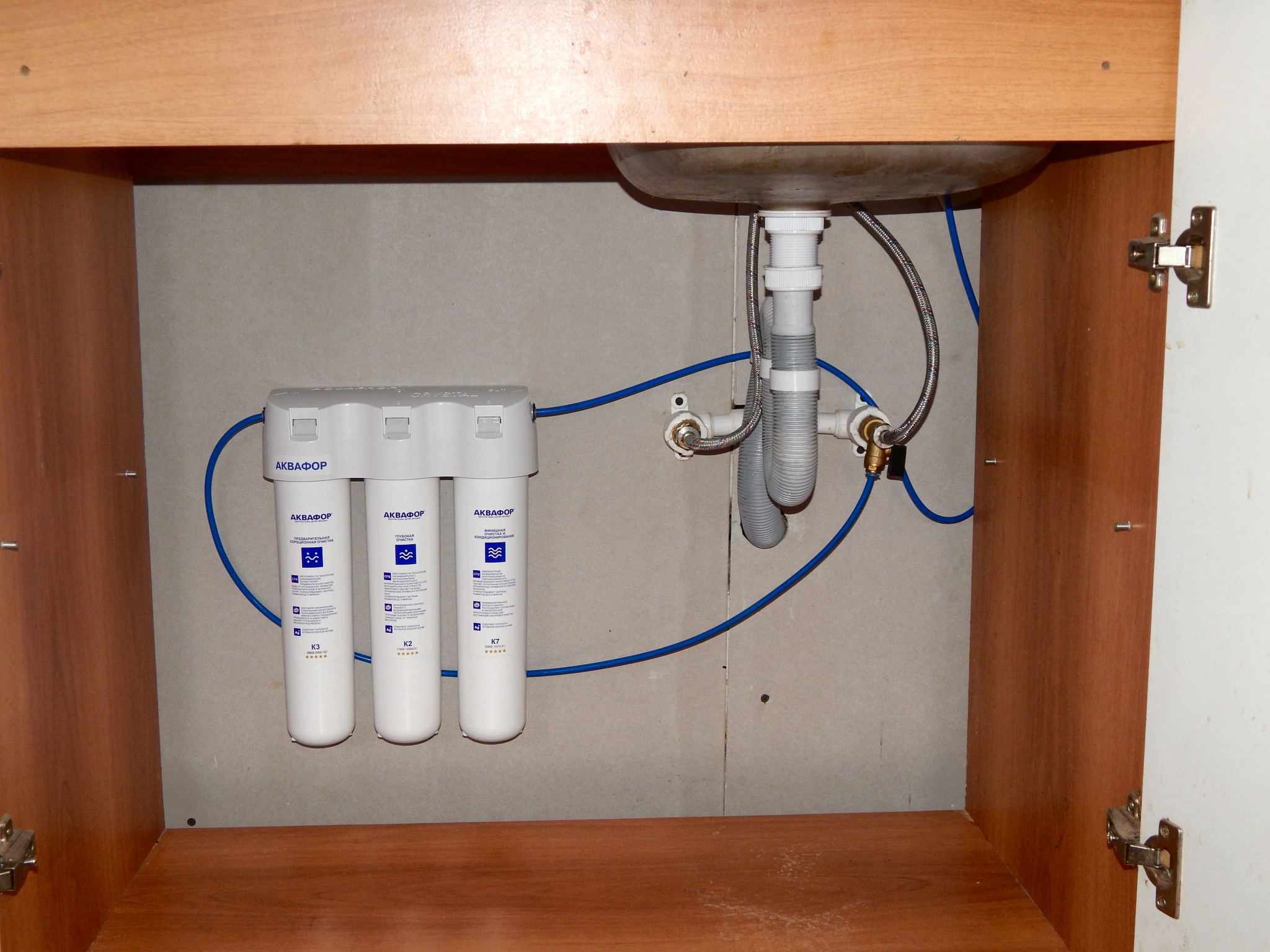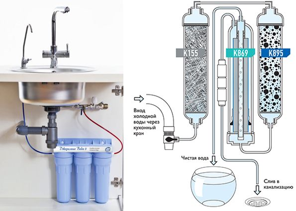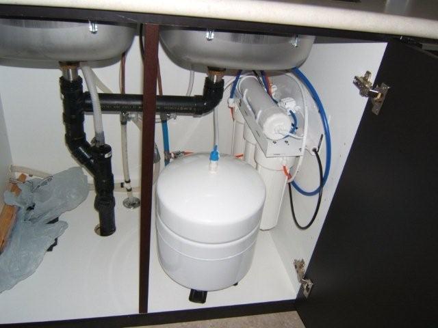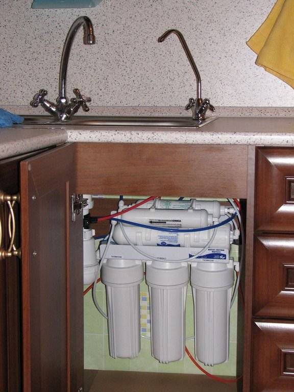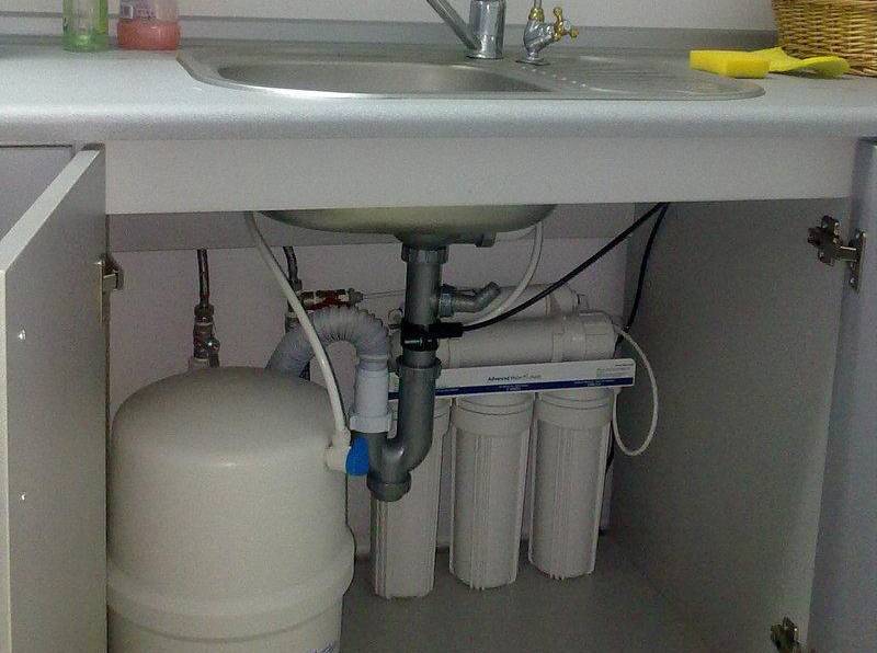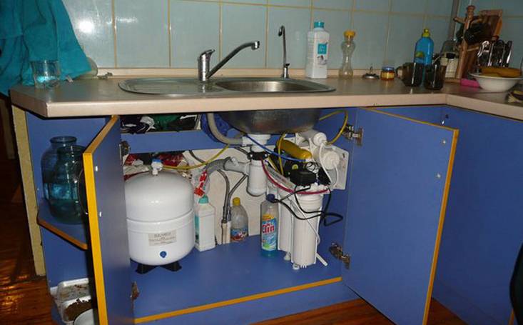 Cartouches assez grosses. Plus un réservoir de stockage dont le volume est d'environ 12 litres (selon le modèle).Tout cela doit être placé sous l'évier de la cuisine - accroché au mur, posé au bas du meuble. Par conséquent, nous recommandons, dans un premier temps, de faire des portes battantes sous l'évier. Grâce à eux, l'appareil deviendra grand, il sera toujours facile d'accès. Il vaut mieux ne pas faire de tiroirs.