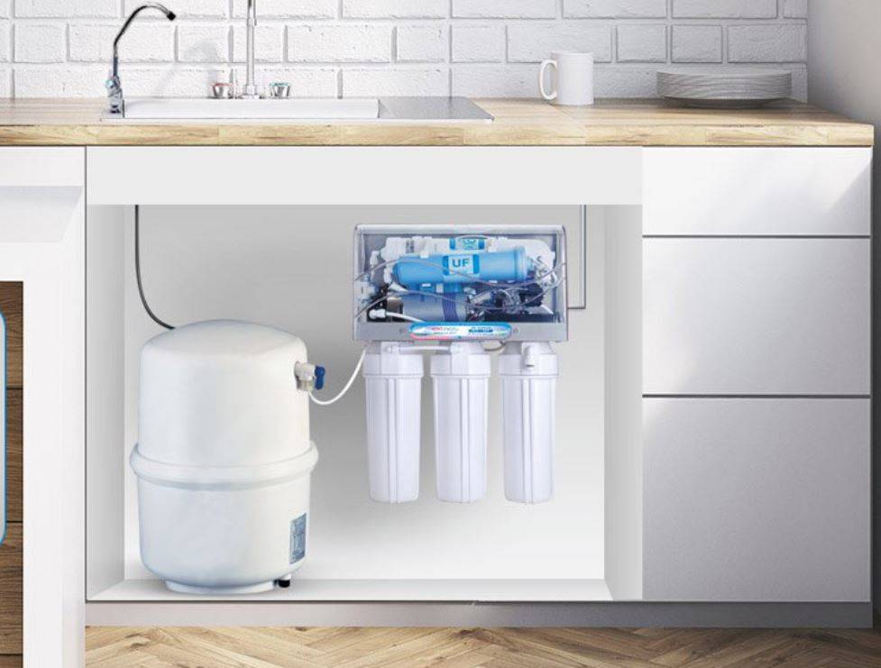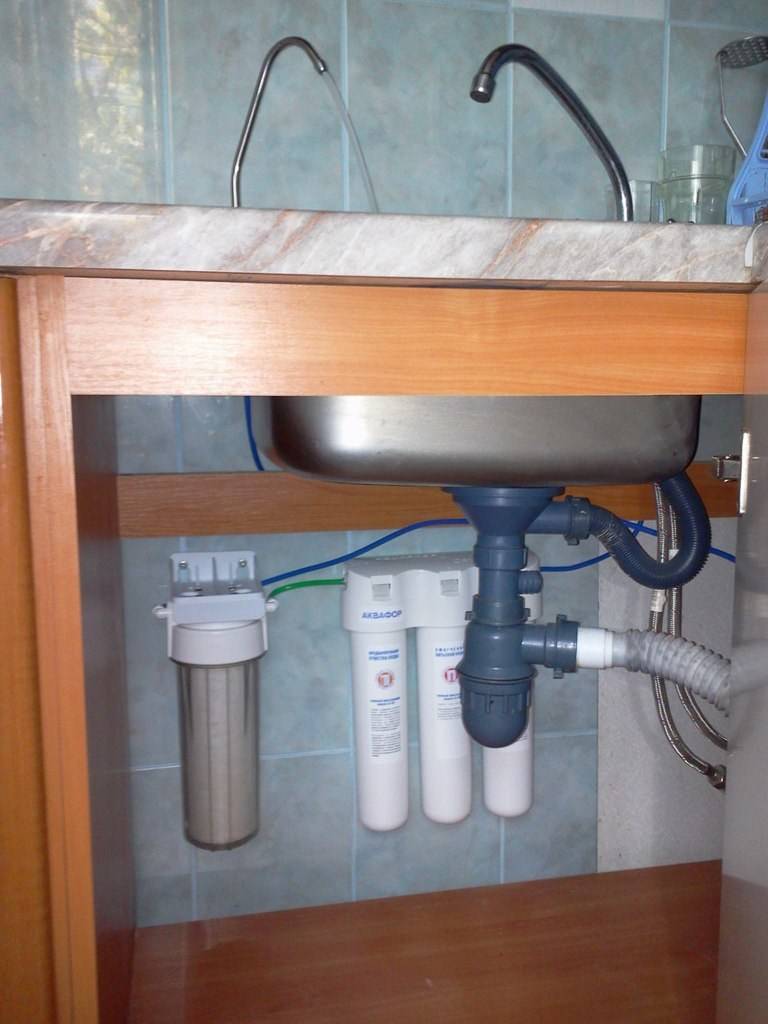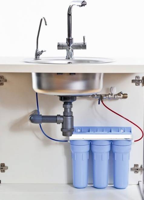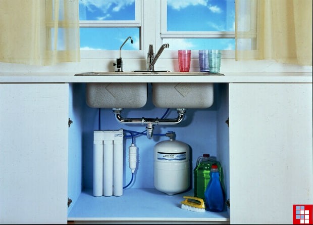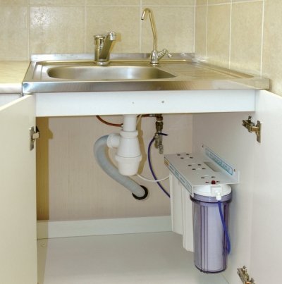 - le filtre fixe "sous l'évier" est installé sous l'évier, vous permet de purifier l'eau des impuretés mécaniques, du chlore, des métaux lourds, d'éliminer les odeurs et les goûts. C'est un système très populaire, il est facile à entretenir, nécessite le remplacement des cartouches tous les 5 à 6 mois, mais le coût de son agencement est plus élevé que les options précédemment répertoriées. Cette solution présente également quelques inconvénients. Le filtre ne résistera pas aux contaminants les plus graves, il a des limites en termes de performances et ne peut pas être installé sur des conduites d'eau chaude.