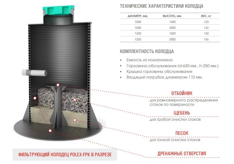 Par exemple, la société russe POLEX-FC, dont les produits ont reçu de bonnes notes auprès des consommateurs. Les puits filtrants sont produits en différents volumes (de 1200x1500 à 2000x3000 mm), ce qui vous permet de choisir un produit en fonction de la consommation d'eau quotidienne d'un ménage individuel.