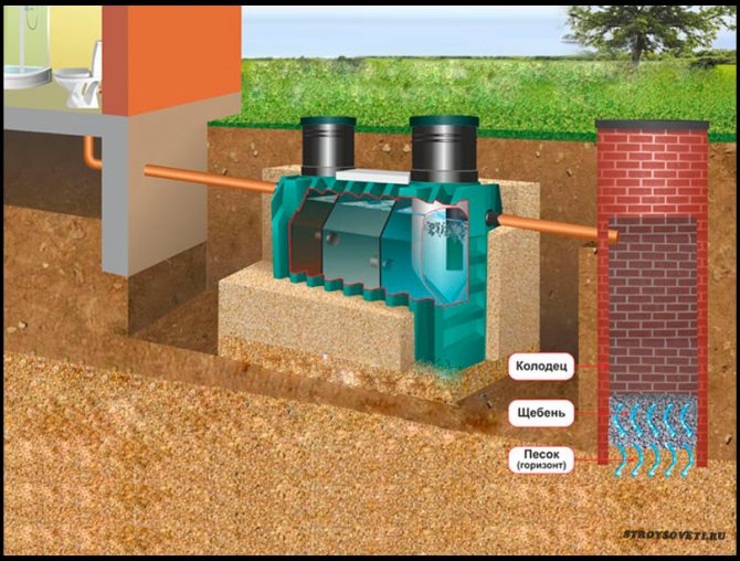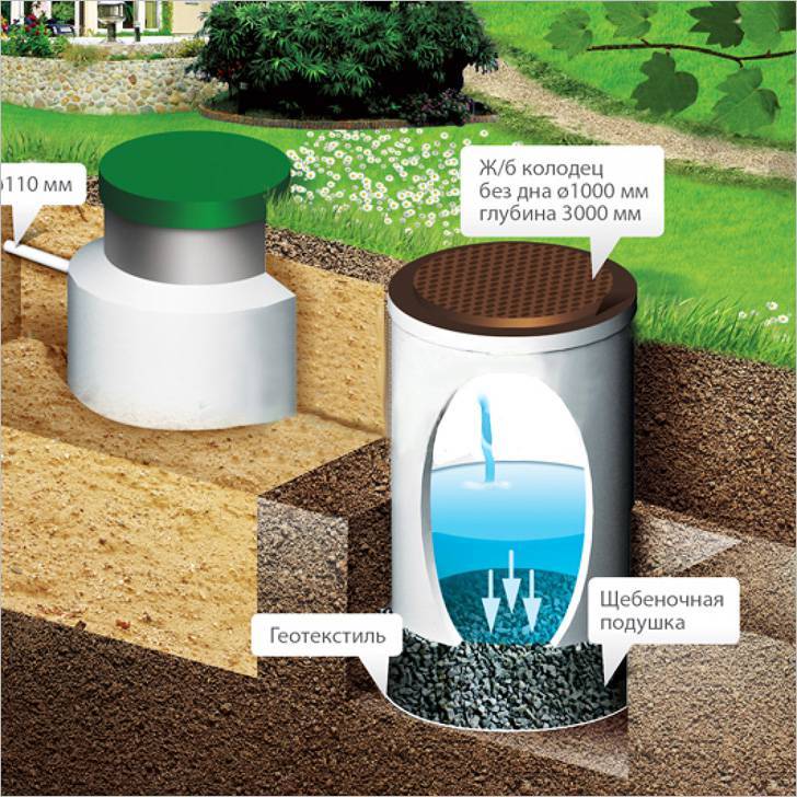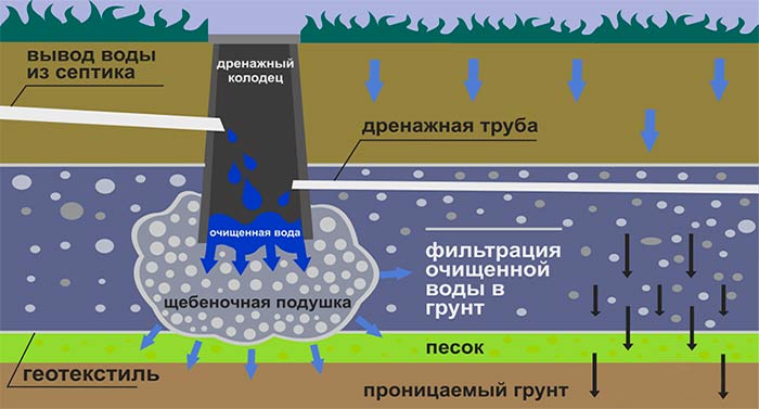 Le dispositif du puits d'absorption diffère des autres types de réservoirs de drainage en ce qu'il n'a pas de fond scellé. Au lieu de cela, un système de filtrage est installé au fond du puits, qui laisse passer les eaux sales à travers lui-même, les nettoie des débris et les rejette dans les couches profondes du sol.